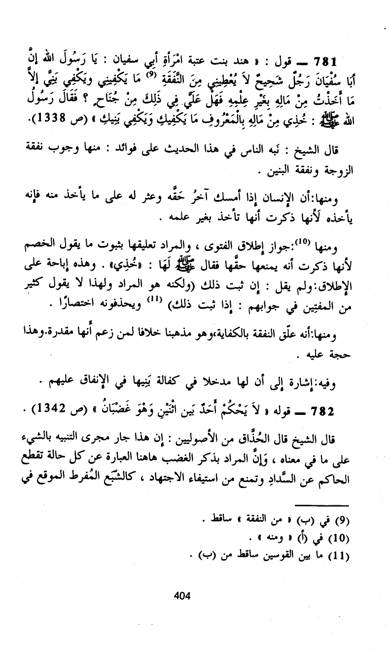 781 - قول: "هند بنت عتبة امْرَأةِ أبِي سفيان: يَا رَسُولَ الله إنَّ اُبَا سُفْيَانَ رَجُلٌ شَحِيحٌ لاَ يُعْطِينِي مِنَ النَّفَقَةِ (¬9) مَا يَكْفِينِي ويَكْفِي بنيَّ إلاَّ مَا أَخَذْتُ مِنْ مَالِهِ بِغيْرِ عِلْمِهِ فَهَلْ عَلَيَّ فِي ذَلِكَ مِنْ جُنَاحٍ؟ فَقَالَ رَسُولُ الله - صلى الله عليه وسلم -: خُذِي مِنْ مَالِهِ بِالْمَعْرُوفِ مَا يَكْفِيكِ وَيَكْفِي بَنِيكِ" (ص 1338).