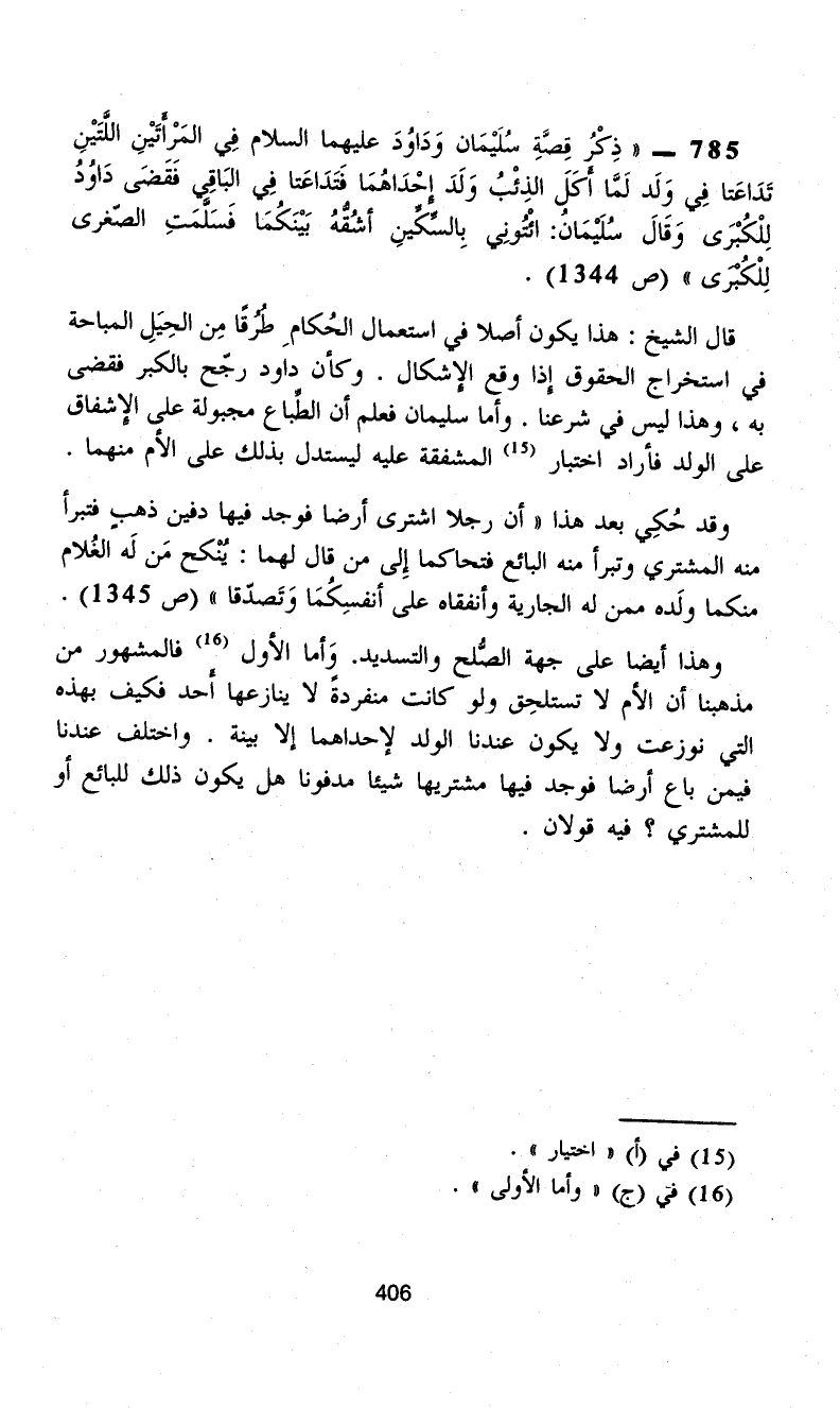 785 - "ذِكْرُ قِصَّةِ سُلَيْمَان وَدَاوُدَ -عليهما السلام- فِي المَرْأَتَيْنِ اللَّتَيْنِ تَدَاعَتا فِي وَلَد لَمَّا أَكَلَ الذِئْبُ وَلَدَ إِحْدَاهُمَا فتَدَاعَتا فِي البَاقِي فَقَضَى دَاوُدُ لِلْكُبْرَى وَقَالَ سُلَيْمَانُ: ائْتُونِي بِالسِّكِّينِ أشُقُّهُ بَيْنَكُمَا فَسَلَّمَتِ الصّغرى لِلْكُبْرَى" (ص 1344).