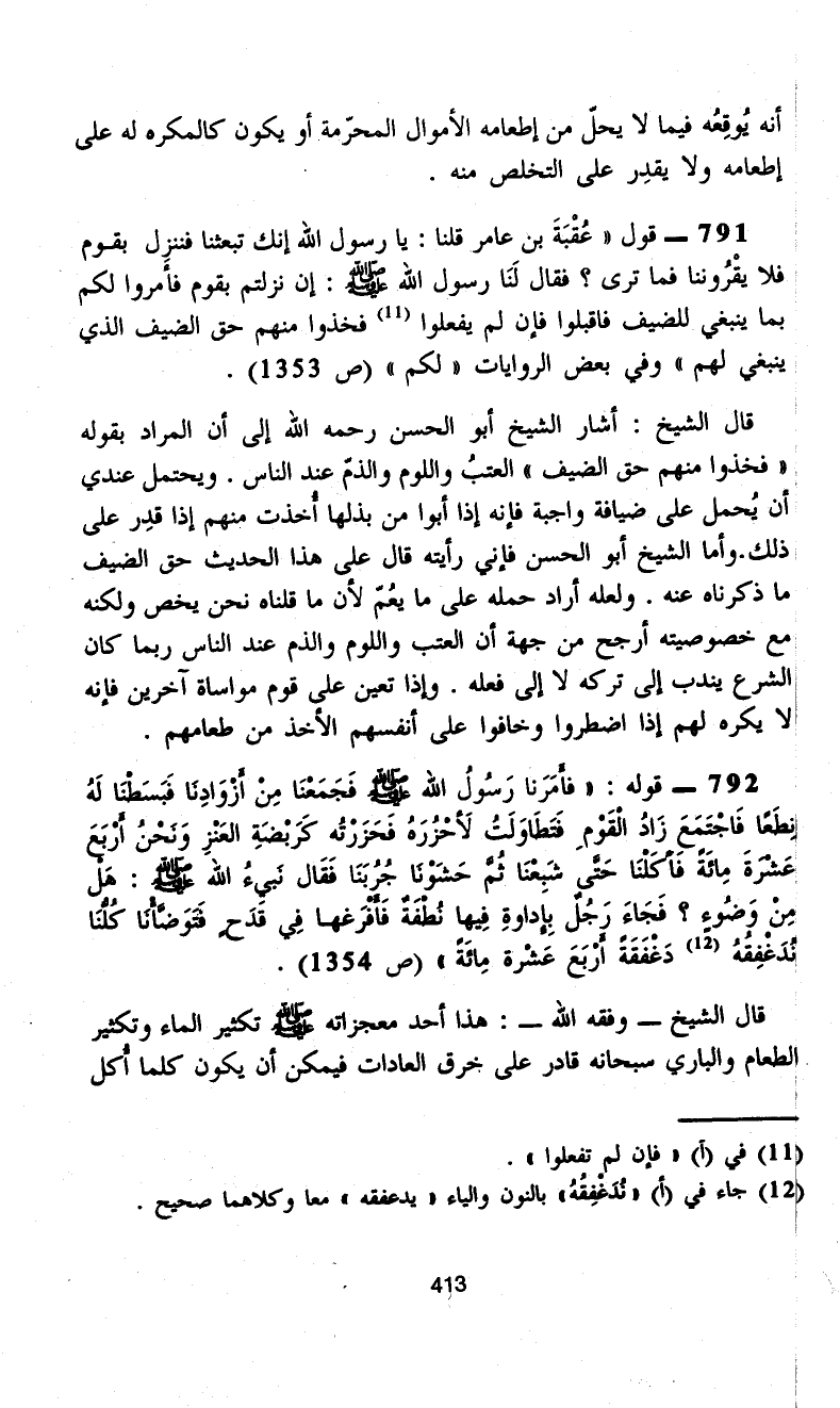791 - قول "عُقْبَةَ بن عامر قلنا: يا رسول الله إنك تبعثنا فننزِل بقوم فلا يقْرُوننا فما ترى؟ فقال لَنَا رسول الله - صلى الله عليه وسلم -: إن نزلتم بقوم فأمروا لكم بما ينبغي للضيف فاقبلوا فإن لم يفعلوا (¬11) فخذوا منهم حق الضيف الذي ينبغي لهم" وفي بعض الروايات "لكم" (ص 1353).