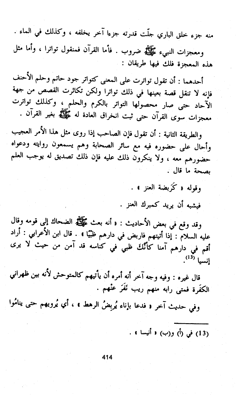 ومعجزات النبيء - صلى الله عليه وسلم - ضروب. فأما القرآن فمنقول تواترا، وأما مثل هذه المعجزة ذلك فيها طريقان: