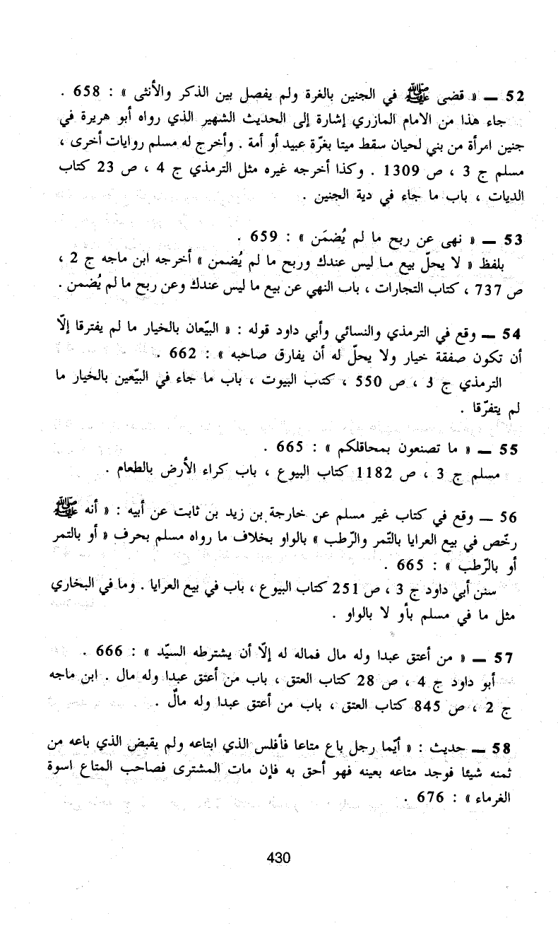 52 - "قضى - صلى الله عليه وسلم - في الجنين بالغرة ولم يفصل بين الذكر والأنثى": 658.