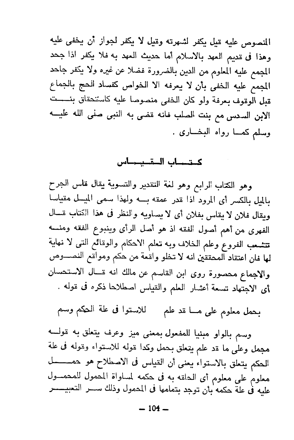 وهو الكتاب الرابع وهو لغة: التقدير والتسوية يقال قاس الجرح بالميل بالكسر أي المرود إذا قدر عمقه به ولهذا سمي الميل مقياسًا ويقال فلان لا يقاس بفلان أي لا يساويه والنظر في هذا الكتاب قال الفهري من أهم أصول الفقه إذ هو أصل الرأي وينبوع الفقه ومنه تتشعب الفروع وعلم الخلاف وبه تعلم الأحكام والوقائع التي لا نهاية لها فإن اعتقاد المحققين أنه لا تخلو واقعة من حكم ومواقع النصوص والإجماع محصورة روى ابن القاسم عن مالك أنه قال: الاستحسان أي الاجتهاد تسعة أعشار العلم والقياس اصطلاحا ذكره في قوله.