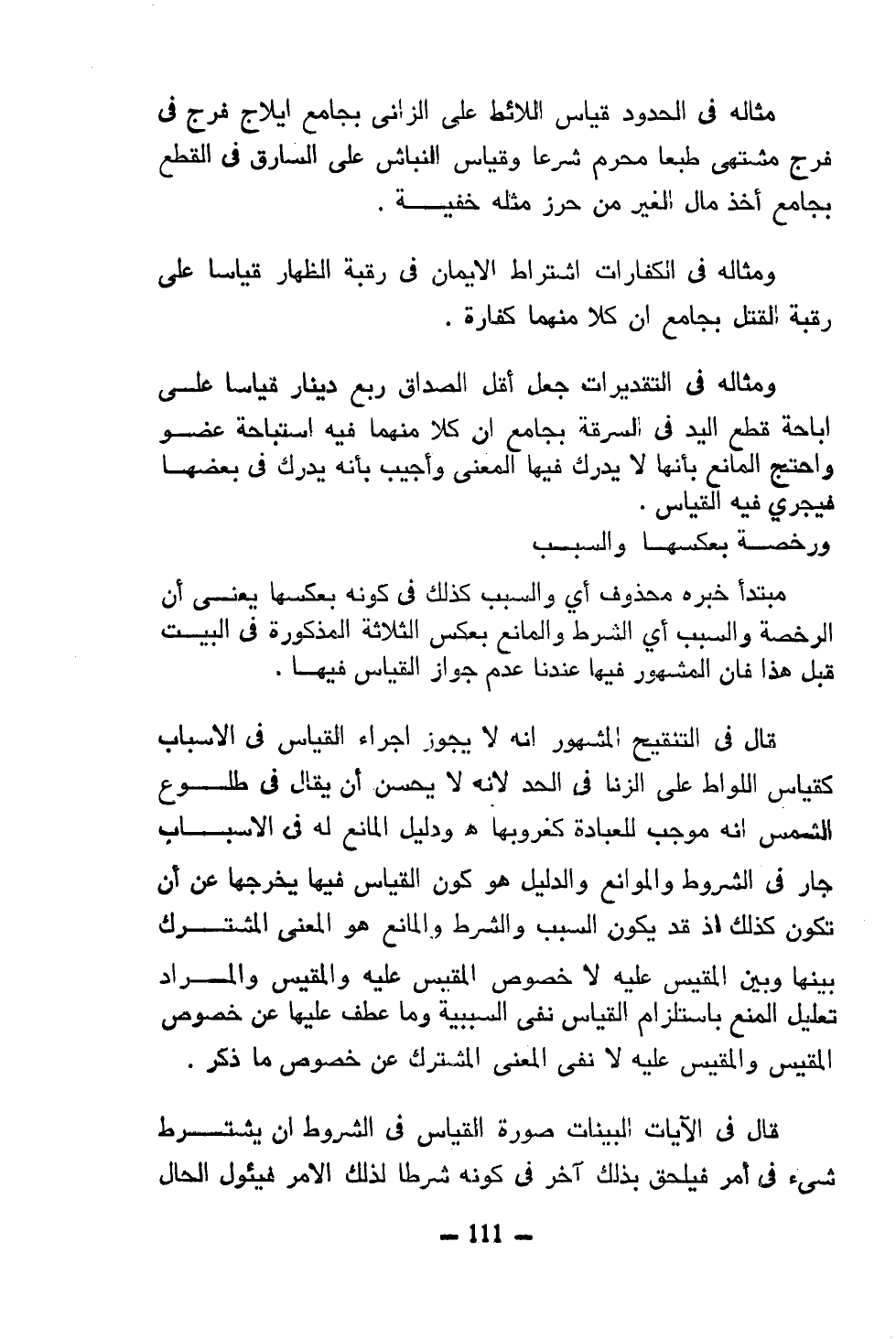 قال في التنقيح المشهور أنه لا يجوز إجراء القياس في الأسباب كقياس اللواط على الزنا في الحد لأنه لا يحسن أن يقال في طلوع الشمس أنه موجب للعبادة كغروبها هـ ودليل المانع له في الأسباب جار في الشروط والموانع والدليل هو كون القياس فيها يخرجها عن أن تكون كذلك إذ قد يكون السبب والشرط والمانع هو المعنى المشترك بينها وبين المقيس عليه لا خصوص المقيس عليه والمقيس والمراد تعليل المنع باستلزام القياس نفي السببية وما عطف عليها عن خصوص المقيس والمقيس عليه لا نفي المعنى المشترك عن خصوص ما ذكر.