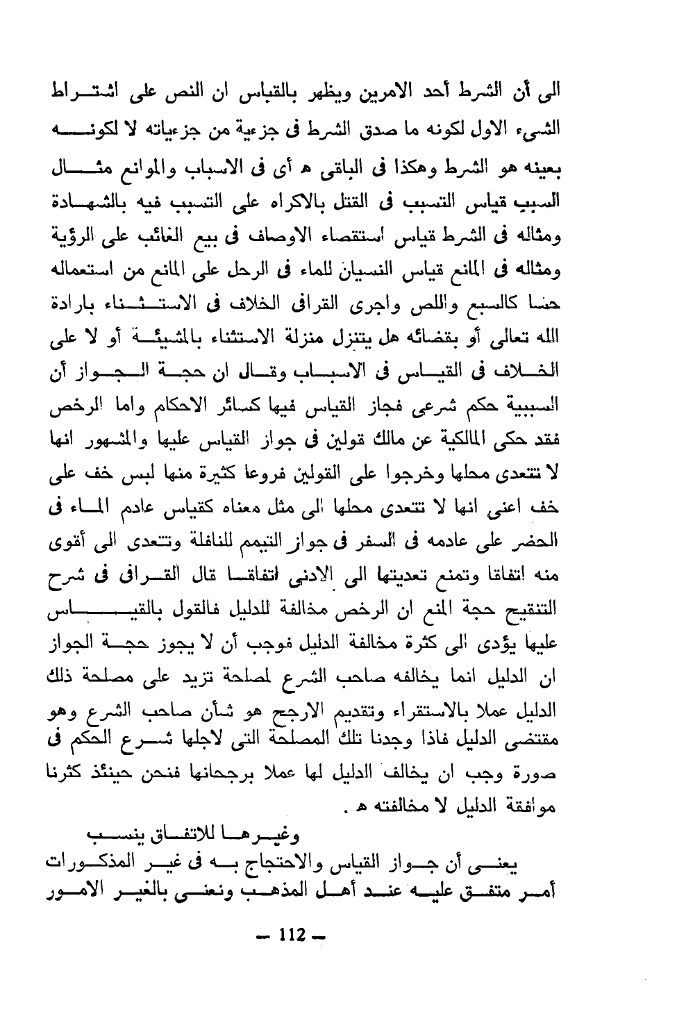 إلى أن الشرط أحد الأمرين ويظهر بالقياس أن النص على اشتراط الشيء الأول لكونه ما صدق الشرط في جزئية من جزئياته لا لكونه بعينه هو الشرط وهكذا في الباقي هـ أي في الأسباب والموانع مثال السبب قياس التسبب في القتل بالإكراه على التسبب فيه بالشهادة ومثاله في الشرط قياس استقصاء الأوصاف في بيع الغائب على الرؤية ومثاله في المانع قياس النسيان للماء في الرحل على المانع من استعماله حسا كالسبع واللص وأجرى القرافى الخلاف في الاستثناء بإرادة الله تعالى أو بقضائه هل يتنزل منزلة الاستثناء بالمشيئة أو لا على الخلاف في القياس في الأسباب وقال إن حجة الجواز أن السببية حكم شرعي فجاز القياس فيها كسائر الأحكام وأما الرخص فقد حكي المالكية عن مالك قولين في جواز القياس عليها والمشهور إنها لا تتعدى محلها وخرجوا على القولين فروعا كثيرة منها لبس خف على خف أعنى أنها لا تتعدى محلها إلى مثل معناه كقياس عادم الماء في الحضر على عادمه في السفر في جواز التيمم للنافلة وتعدى إلى أقوى منه اتفاقا وتمنع تعديتها إلى الأدنى اتفاقا قال القرافي في شرح التنقيح حجة المنع إن الرخص مخالفة للدليل فالقول بالقياس عليها يؤدى إلى كثرة مخالفة الدليل فوجب أن لا يجوز حجة الجواز أن الدليل إنما يخالفه صاحب الشرع لمصلحة تزيد على مصلحة ذلك الدليل عملا بالاستقراء وتقديم الأرجح هو شأن صاحب الشرع وهو مقتضى الدليل فإذا وجدنا تلك المصلحة التي لأجلها شرع الحكم في صورة وجب أن يخالف الدليل لها عملا برجحانها فنحن حينئذ كثرنا موافقة الدليل لا مخالفته هـ.