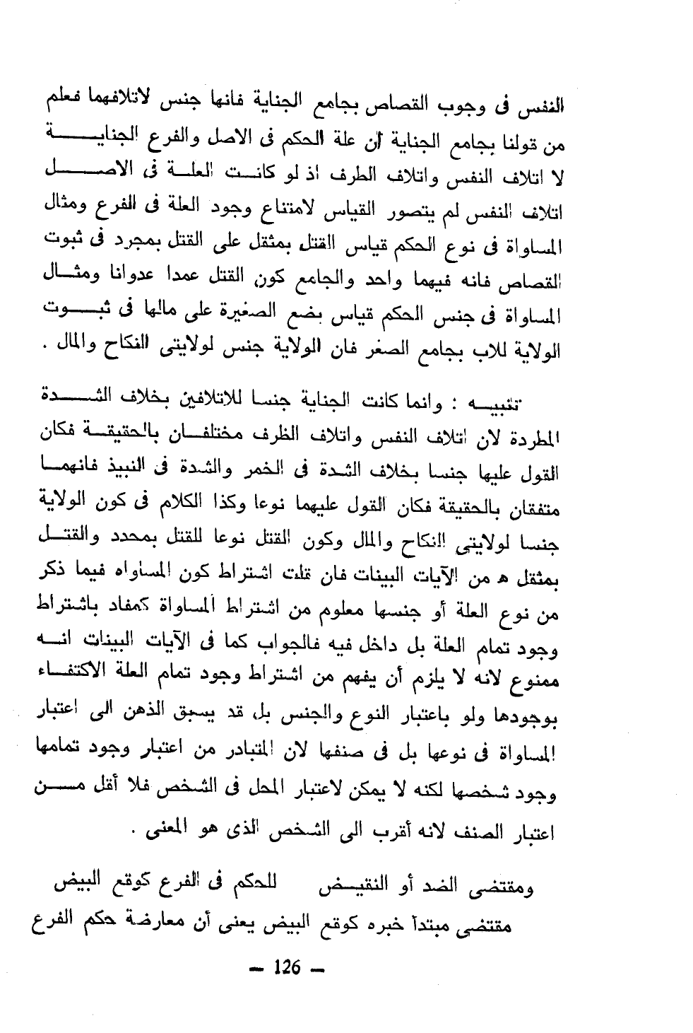 تنبيه: وإنما كانت الجناية جنسا للاتلافين بخلاف الشدة المطردة لأن إتلاف النفس وإتلاف الظرف مختلفان بالحقيقة فكان القول عليها جنسا بخلاف الشدة في الخمر والشدة في النبيذ فإنهما متفقان بالحقيقة فكان القول عليهما نوعا وكذا الكلام في كون الولاية جنسا لولايتي النكاح والمال وكون القتل نوعا للقتل بمحدد والقتل بمثقل هـ من الآيات البينات فإن قلت اشتراط كون المساواة فيما ذكر من نوع العلة أو جنسها معلوم من اشتراط المساواة كمفاد باشتراط وجود تمام العلة بل داخل فيه فالجواب كما في الآيات البينات أنه ممنوع لأنه لا يلزم أن يفهم من اشتراط وجود تمام العلة الاكتفاء بوجودها ولو باعتبار النوع والجنس بل قد يسبق الذهن إلى اعتبار المساواة في نوعها بل في صنفها لأن المتبادر من اعتبار وجود تمامها وجود شخصها لكنه لا يمكن لاعتبار المحل في الشخص فلا أقل من اعتبار الصنف لأنه أقرب إلى الشخص الذي هو المعنى.