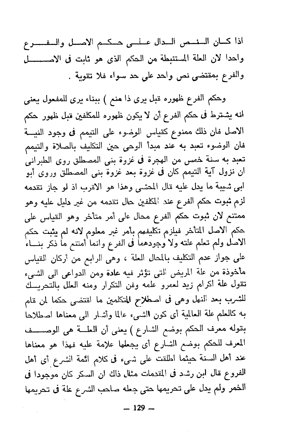 وحكم الفرع ظهوره قبل يرى ذا منع) ببناء يرى للمفعول يعني أنه يشترط في حكم الفرع أن لا يكون ظهوره للمكلفين قبل ظهور حكم الأصل فإن ذلك ممنوع كقياس الوضوء على التيمم في وجود النية فإن الوضوء تعبد به عند مبدأ الوحي حين التكليف بالصلاة والتيمم تعبد به سنة خمس من الهجرة في غزوة بني المصطلق روى الطبراني إن نزول آية التيمم كان في غزوة بعد غزوة بني المصطلق وروى أبو أبي شيبة ما يدل عليه قال المحشي وهذا هو الأقرب إذ لو جاز تقدمه لزم ثبوت حكم الفرع عند المكلفين حال تقدمه من غير دليل عليه وهو ممتنع لأن ثبوت حكم الفرع محال على أمر متأخر وهو القياس على حكم الأصل المتأخر فيلزم تكليفهم بأمر غير معلوم لأنه لم يثبت حكم الأصل ولم تعلم علته ولا وجودهما في الفرع وإنما امتنع ما ذكر بناء على جواز عدم التكليف بالمحال العلة، وهي الرابع من أركان القياس مأخوذة من علة المريض التي تؤثر فيه عادة ومن الدواعي إلى الشيء تقول علة إكرام زيد لعمرو علمه وفن التكرار ومنه العلل بالتحريك للشرب بعد النهل وهي في اصطلاح المتكلمين ما اقتضى حكما لمن قام به كالعلم علة العالمية أي كون الشيء عالما وأشار إلى معناها اصطلاحا بقوله معرف الحكم بوضع الشارع) يعني أن العلة هي الوصف المعرف للحكم بوضع الشارع أي يجعلها علامة عليه فهذا هو معناها عند أهل السنة حيثما أطلقت على شيء في كلام أئمة الشرع أي أهل الفروع قال ابن رشد في المقدمات مثال ذلك إن السكر كان موجودا في الخمر ولم يدل على تحريمها حتى جعله صاحب الشرع علة في تحريمها