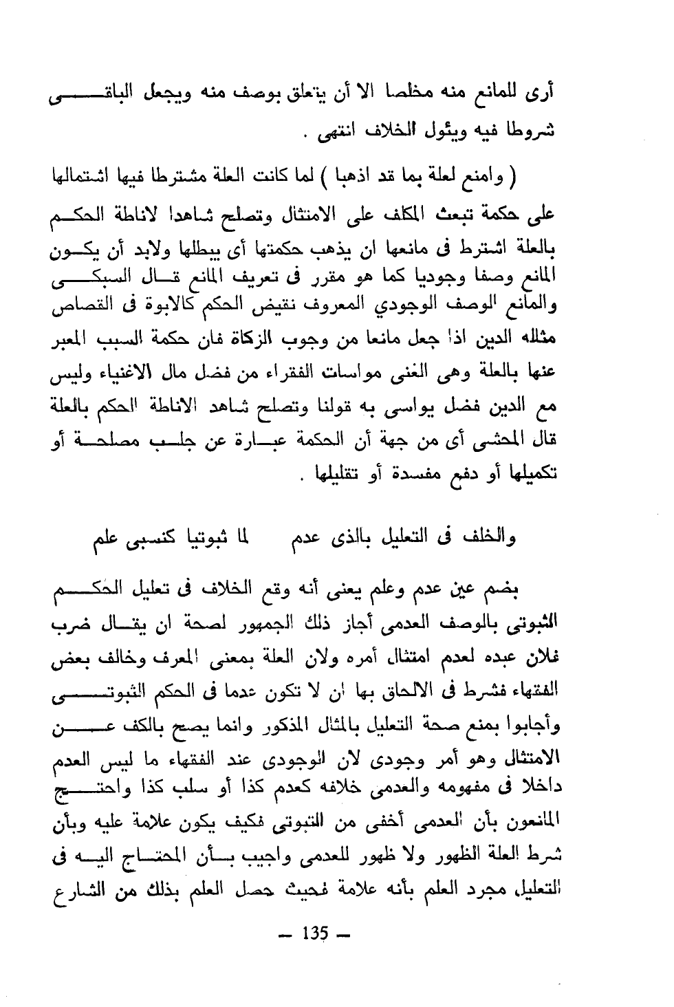 بضم عين عدم وعلم يعني أنه وقع الخلاف في تعليل الحكم الثبوتي بالوصف العدمي أجاز ذلك الجمهور لصحة أن يقال ضرب فلان عبده لعدم امتثال أمره ولأن العلة بمعنى المعرف وخالف بعض الفقهاء فشرط في الإلحاق بها أن لا تكون عدما في الحكم الثبوتي وأجابوا بمنع صحة التعليل بالمثال المذكور وإنما يصح بالكف عن الامتثال وهو أمر وجودي لأن الوجودي عند الفقهاء ما ليس العدم داخلا في مفهومه والعدمي خلافه كعدم كذا أو سلب كذا واحتج المانعون بأن العدمى أخفى من التبوتي فكيف يكون علامة عليه وبأن شرط العلة الظهور ولا ظهور للعدمي وأجيب بأن المحتاج إليه في التعليل مجرد العلم بأنه علامة فحيث حصل العلم بذلك من الشارع