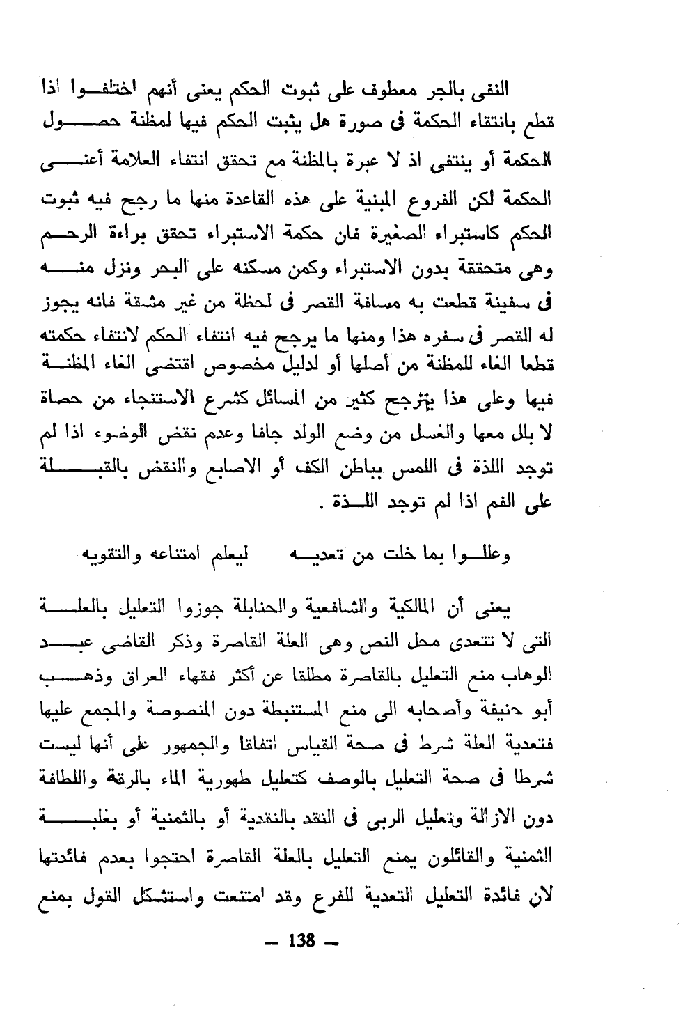 يعني أن المالكية والشافعية والحنابلة جوزوا التعليل بالعلة التي لا تتعدى محل النص وهي العلة القاصرة وذكر القاضي عبد الوهاب منع التعليل بالقاصرة مطلقا عن أكثر فقهاء العراق وذهب أبو حنيفة وأصحابه إلى منع المستنبطة دون المنصوصة والمجمع عليها فتعدية العلة شرط في صحة القياس اتفاقا والجمهور على أنها ليست شرطا في صحة التعليل بالوصف كتعليل طهورية الماء بالرقة واللطافة دون الإزالة وتعليل الربى في النقد بالنقدية أو بالثمنية أو بغلبة الثمنية والقائلون يمنع التعليل بالعلة القاصرة احتجوا بعدم فائدتها لأن فائدة التعليل التعدية للفرع وقد امتنعت واستشكل القول بمنع