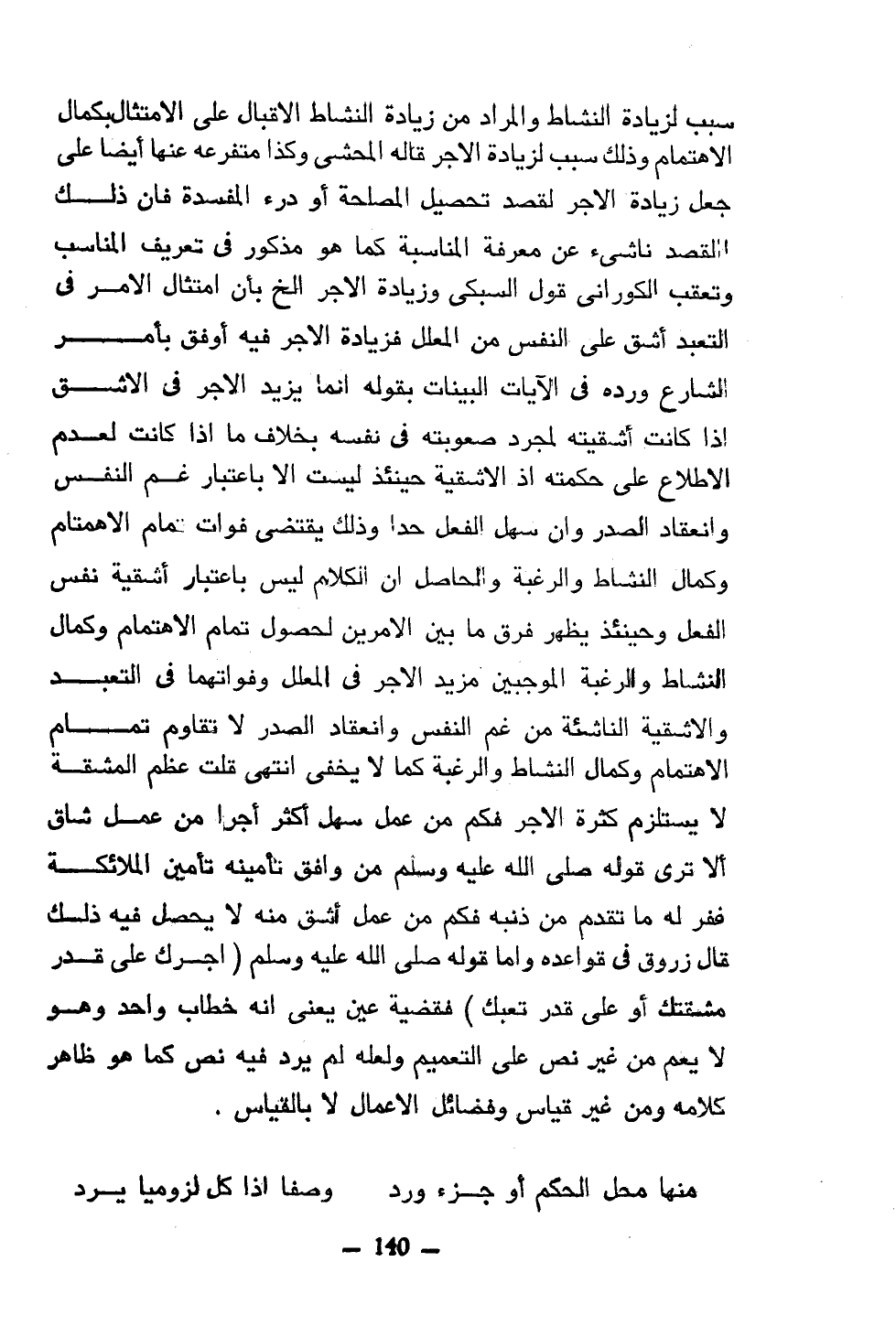 سبب لزيادة النشاط والمراد من زيادة النشاط الإقبال على الامتثال بكمال الاهتمام وذلك سبب لزيادة الأجر قاله المحشي وكذا متفرعه عنها أيضا على جعل زيادة الأجر لقصد تحصيل المصلحة أو درء المفسدة فإن ذلك القصد ناشئ عن معرفة المناسبة كما هو مذكور في تعريف المناسب وتعقب الكوراني قول السبكي وزيادة الأجر الخ بأن امتثال الأمر في التعبد أشق على النفس من المعلل فزيادة الأجر فيه أوفق بأمر الشارع ورده في الآيات البينات بقوله إنما يزيد الأجر في الأشق إذا كانت أشقيته لمجرد صعوبته في نفسه بخلاف ما إذا كانت لعدم الإطلاع على حكمته إذ الأشقية حينئذ ليست إلا باعتبار غم النفس وانعقاد الصدر وإن سهل الفعل حدا وذلك يقتضى فوات تمام الاهتمام وكمال النشاط والرغبة والحاصل إن الكلام ليس باعتبار أشقية نفس الفعل وحينئذ يظهر فرق ما بين الأمرين لحصول تمام الاهتمام وكمال النشاط والرغبة الموجبين مزيد الأجر في المعلل وفواتهما في التعبد والأشقية الناشئة من غم النفس وانعقاد الصدر لا تقاوم تمام الاهتمام وكمال النشاط والرغبة كما لا يخفى انتهى قلت عظم المشقة لا يستلزم كثرة الأجر فكم من عمل سهل أكثر أجرا من عمل شاق ألا ترى قوله صلى الله عليه وسلم من وافق تأمينه تأمين الملائكة ففر له ما تقدم من ذنبه فكم من عمل أشق منه لا يحصل فيه ذلك قال زروق في قواعده وأما قوله صلى الله عليه وسلم (أجرك على قدر مشقتك أو على قدر تعبك) فقضية عين يعني أنه خطاب واحد وهو لا يعم من غير نص على التعميم ولعله لم يرد فيه نص كما هو ظاهر كلامه ومن غير قياس وفضائل الأعمال لا بالقياس.