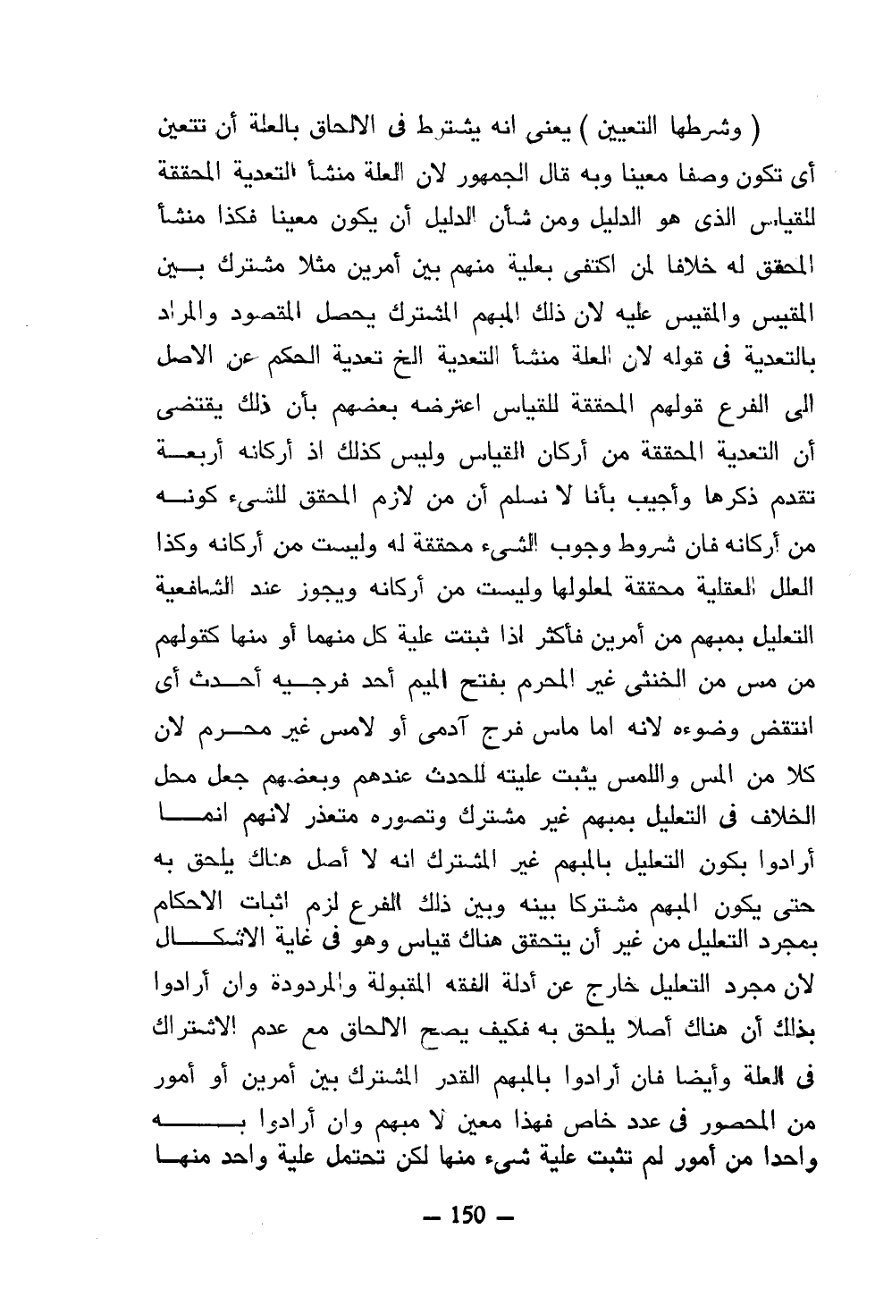 (وشرطها التعيين) يعني أنه يشترط في الإلحاق بالعلة أن تتعين أي تكون وصفا معينا وبه قال الجمهور لأن العلة منشأ التعدية المحققة للقياس الذي هو الدليل ومن شأن الدليل أن يكون معينا فكذا منشأ المحقق له خلافا لمن اكتفى بعلية منهم بين أمرين مثلا مشترك بين المقيس والمقيس عليه لأن ذلك المبهم المشترك يحصل المقصود والمراد بالتعدية في قوله لأن العلة منشأ التعدية الخ تعدية الحكم عن الأصل إلى الفرع قولهم المحققة للقياس اعترضه بعضهم بأن ذلك يقتضى أن التعدية المحققة من أركان القياس وليس كذلك إذ أركانه أربعة تقدم ذكرها وأجيب بأنا لا نسلم أن من لازم المحقق للشيء كونه من أركانه فإن شروط وجوب الشيء محققة له وليست من أركانه وكذا العلل العقلية محققة لمعلولها وليست من أركانه ويجوز عند الشافعية التعليل بمبهم من أمرين فأكثر إذا ثبتت عليه كل منهما أو منها كقولهم من مس من الخنثى غير المحرم بفتح الميم أحد فرجيه أحدث أي انتقض وضوءه لأنه إما ماس فرج آدمي أو لامس غير محرم لأن كلا من المس واللمس يثبت عليته للحدث عندهم وبعضهم جعل محل الخلاف في التعليل بمبهم غير مشترك وتصوره متعذر لأنهم إنما أرادوا بكون التعليل بالمبهم غير المشترك أنه لا أصل هناك يلحق به حتى يكون المبهم مشتركا بينه وبين ذلك الفرع لزم إثبات الأحكام بمجرد التعليل من غير أن يتحقق هناك قياس وهو في غاية الأشكال لأن مجرد التعليل خارج عن أدلة الفقه المقبولة والمردودة وإن أرادوا بذلك أن هناك أصلا يلحق به فكيف يصح الإلحاق مع عدم الاشتراك في العلة وأيضا فإن أرادوا بالمبهم القدر المشترك بين أمرين أو أمور من المحصور في عدد خاص فهذا معين لا مبهم وإن أرادوا به واحدا من أمور لم تثبت علية شيء منها لكن تحتمل عليه واحد منها