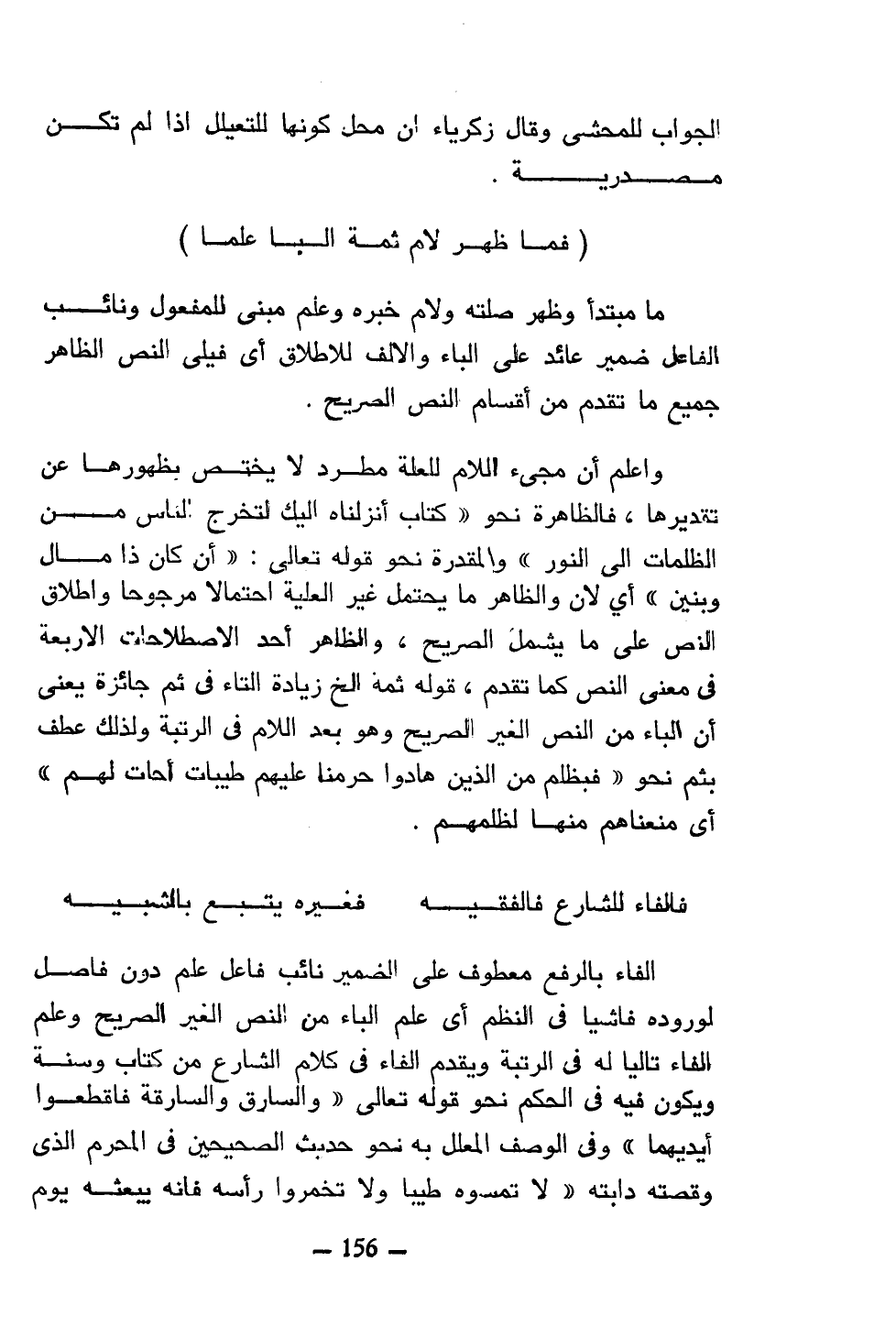 واعلم أن مجيء اللام للعلة مطرد لا يختص بظهورها عن تقديرها، فالظاهرة نحو "كتاب أنزلناه إليك لتخرج الناس من الظلمات إلى النور" والمقدرة نحو قوله تعالى: "أن كان ذا مال وبنين" أي لأن والظاهر ما يحتمل غير العلية احتمالا مرجوحا وإطلاق النص على ما يشمل الصريح، والظاهر أحد الاصطلاحات الأربعة في معنى النص كما تقدم، قوله ثمة الخ زيادة التاء في ثم جائزة يعني أن الباء من النص الغير الصريح وهو بعد اللام في الرتبة ولذلك عطف بثم نحو "فبظلم من الذين هادوا حرمنا عليهم طيبات أحات لهم" أي منعناهم منها لظلمهم.
