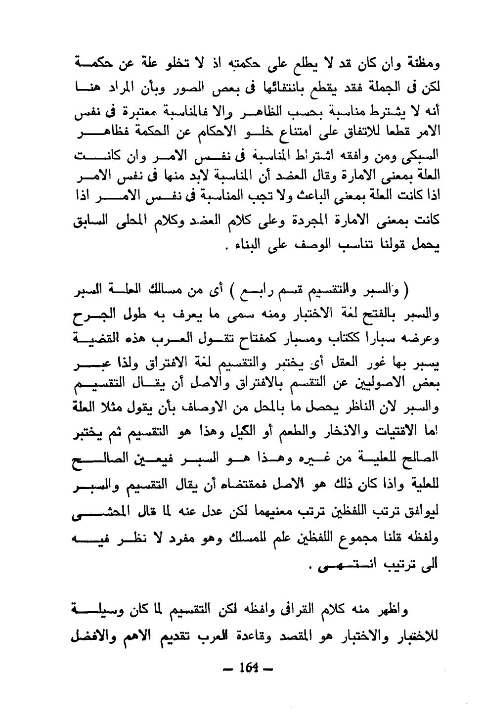 وأظهر منه كلام القرافي وافظه لكن التقسيم لما كان وسيلة للاختبار والاختبار هو المقصد وقاعدة العرب تقديم الأهم والأفضل
