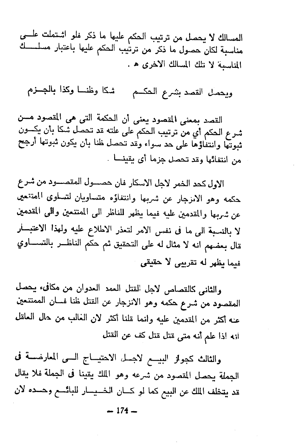 الأول كحد الخمر لأجل الاسكار فإن حصول المقصود من شرع حكمه وهو الانزجار عن شربها وانتفاؤه مستاويان لتساوي الممتنعين عن شربها والمقدمين عليه فيما يظهر للناظر إلى اللمتنعين وإلى المقدمين لا بالنسبة إلى ما في نفس الأمر لتعذر الإطلاع عليه ولهذا الاعتبار قال بعضهم أنه لا مثال له على التحقيق ثم حكم الناظر بالتساوي فيما يظهر له تقريبي لا حقيقي