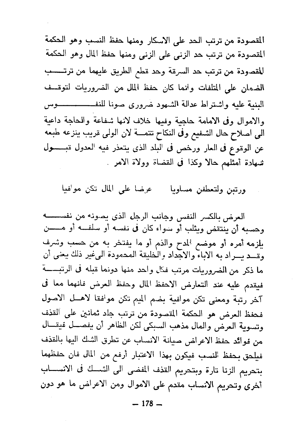 المقصودة من ترتب الحد على الاسكار ومنها حفظ النسب وهو الحكمة المقصودة من ترتب حد الزنى على الزنى ومنها حفظ المال وهو الحكمة المقصودة من ترتب حد السرقة وحد قطع الطريق عليهما من ترتب الضمان على المتلفات وإنما كان حفظ المال من الضروريات لتوقف البنية عليه واشتراط عدالة الشهود ضروري صونا للنفوس والأموال وفي الإمامة حاجية وفيها خلاف لأنها شفاعة والحاجة داعية إلى إصلاح حال الشفيع وفي النكاح تتمة لأن الولي قريب ينزعه طبعه عن الوقوع في العار ورخص في البلد الذي يتعذر فيه العدول قبول شهادة أمثلهم حالا وكذا في القضاة وولاة الأمر.
