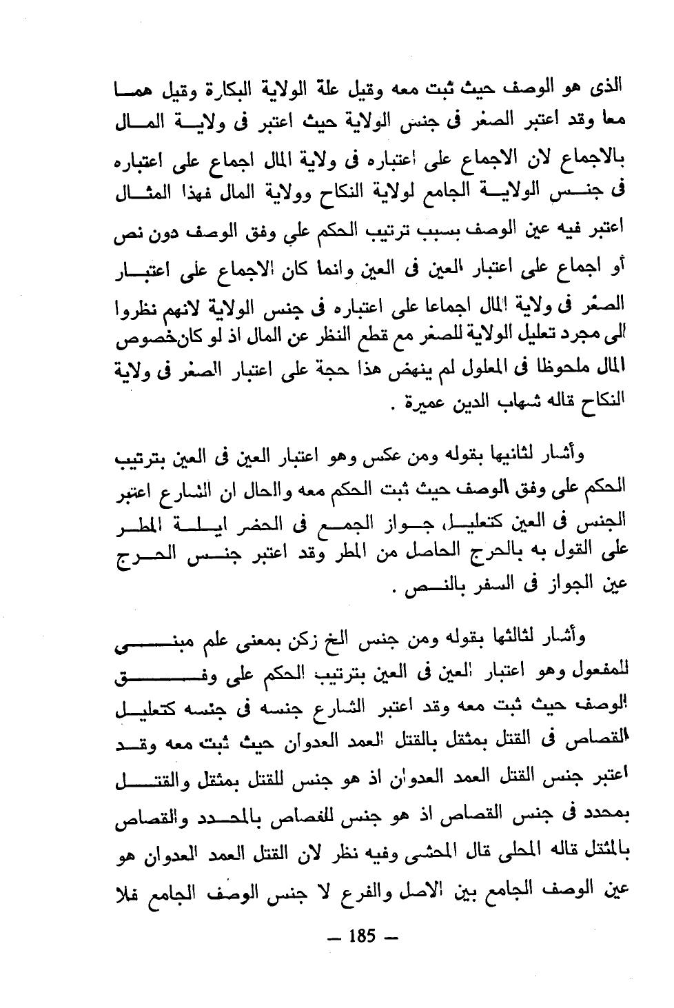 الذي هو الوصف حيث ثبت معه وقيل علة الولاية البكارة وقيل هما معا وقد اعتبر الصغر في جنس الولاية حيث اعتبر في ولاية المال بالإجماع لأن الإجماع على اعتباره في ولاية المال إجماع على اعتباره في جنس الولاية الجامع لولاية النكاح وولاية المال فهذا المثال اعتبر فيه عين الوصف بسبب ترتيب الحكم على وفق الوصف دون نص أو إجماع على اعتبار العين في العين وإنما كان الإجماع على اعتبار الصغر في ولاية المال إجماعا على اعتبار في جنس الولاية لأنهم نظروا إلى مجرد تعليل الولاية للصغر مع قطع النظر عن المال إذ لو كان خصوص المال ملحوظا في المعلول لم ينهض هذا حجة على اعتبار الصغر في ولاية النكاح قاله شهاب الدين عميرة.