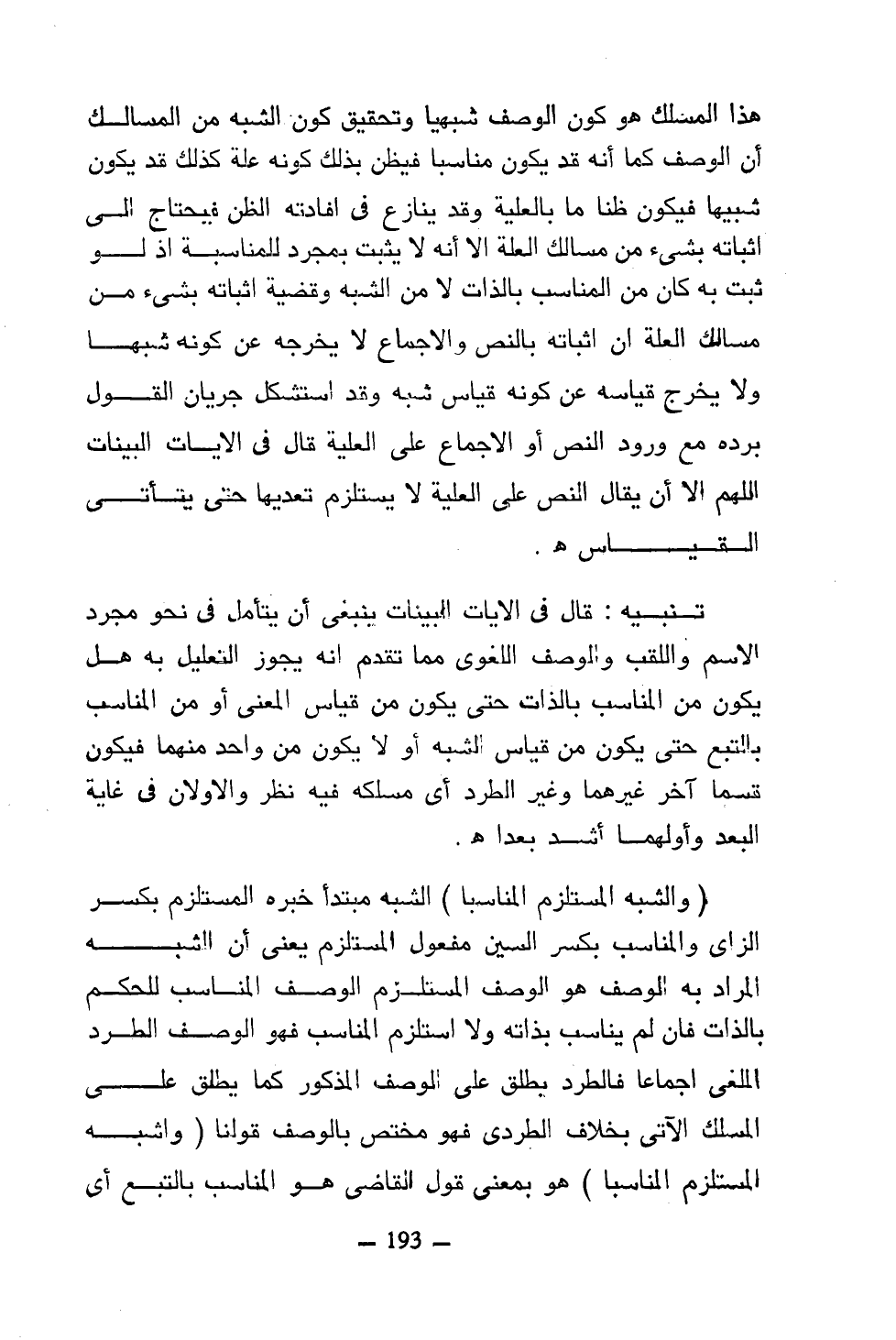 تنبيه: قال في الآيات البينات ينبغي أن يتأمل في نحو مجرد الاسم واللقب والوصف اللغوي مما تقدم أنه يجوز التعليل به هل يكون من المناسب بالذات حتى يكون من قياس المعنى أو من المناسب بالتبع حتى يكون من قياس الشبه أو لا يكون من واحد منهما فيكون قسمًا آخر غيرهما وغير الطرد أي مسلكه فيه نظر والأولان في غاية البعد وألهما أشد بعدًا هـ.