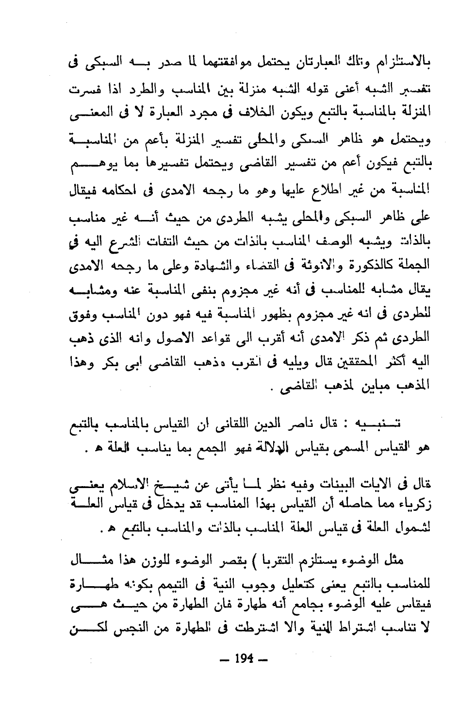 بالاستلزام وتلك العبارتان يحتمل موافقتهما لما صدر به السبكي في تفسير الشبه أعني قوله منزلة بين المناسب والطرد إذا فسرت المنزلة بالمناسبة بالتبع ويكون الخلاف في مجرد العبارة لا في المعنى ويحتمل هو ظاهر السبكي والمحلي تفسير المنزلة بأعم من المناسبة بالتبع فيكون أعم من تفسير القاضي ويحتمل تفسيرها بما يوهم المناسبة من غير إطلاع عليها وهو ما رجحه الأمدي في أحكامه فيقال على ظاهر السبكي والمحلي يشبه الطردي من حيث أنه غير مناسب بالذات ويشبه الوصف المناسب بالذات من حيث التفات الشرع إليه في الجملة كالذكورة والأنوثة في القضاء والشهادة وعلى ما رجحه الأمدي يقال مشابه للمناسب في أنه غير مجزوم بنفي المناسبة عنه ومشابه للطردي في أنه غير مجزوم بظهور المناسبة فيه فهو دون المناسب وفوق الطردي ثم ذكر الأمدي أنه أقرب إلى قواعد الأصول وأنه الذي ذهب إليه أكثر المحققين قال ويليه في القرب وذهب القاضي أبي بكر وهذا المذهب مباين لمذهب القاضي.