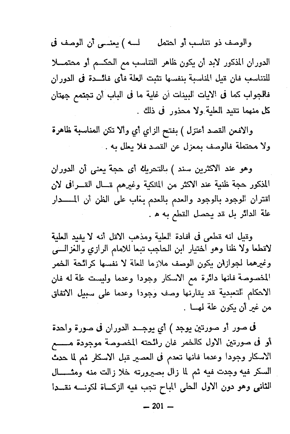 في صور أو صورتين يوجد) أي يوجد الدوران في صورة واحدة أو في صورتين الأول كالخمر فإن رائحته المخصوصة موجودة مع الإسكار وجودًا وعدمًا فإنها تعدم في العصير قبل الإسكار ثم لما حدث السكر فيه وجدت فيه ثم لما زال بصيرورته خلا زالت منه ومثال الثاني وهو دون الأول الحلي المباح تجب فيه الزكاة لكونه نقدًا