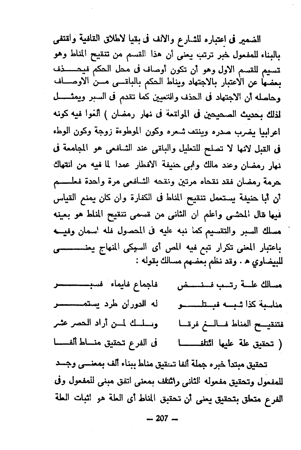 الضمير في اعتباره للشارع والألف في بقيا لإطلاق القافية واقتفى بالبناء للمفعول خبر ترتب يعني أن هذا القسم من تنقيح المناط وهو قسيم للقسم الأول وهو أن تكون أوصاف في محل الحكم فيحذف بعضها عن الاعتبار بالاجتهاد ويناط الحكم بالباقي من الأوصاف وحاصله أن الاجتهاد في الحذف والتعيين كما تقدم في السبر ويمثل لذلك بحديث الصحيحين في المواقعة في نهار رمضان) ألغوا فيه كونه أعرابيًا يضرب صدره وينتف شعره وكون الموطوءة زوجة وكون الوطء في القبل لأنها لا تصلح للتعليل والباقي عند الشافعي هو المجامعة في نهار رمضان وعند مالك وأبي حنيفة الإفطار عمدًا لما فيه من انتهاك حرمة رمضان فقد نقحاه مرتين ونقحة الشافعي مرة واحدة فعلم أن أبا حنيفة يستعمل تنقيح المناط في الكفارة وإن كان يمنع القياس فيها قال المحشي واعلم أن الثاني من قسمي تنقيح المناط هو بعينه مسلك السبر والتقسيم كما نبه عليه في المحصول فله اسمان وفيه باعتبار المعنى تكرار تبع فيه المص أي السبكي المنهاج يعني للبيضاوي هـ. وقد نظم بعضهم مسالك بقوله: