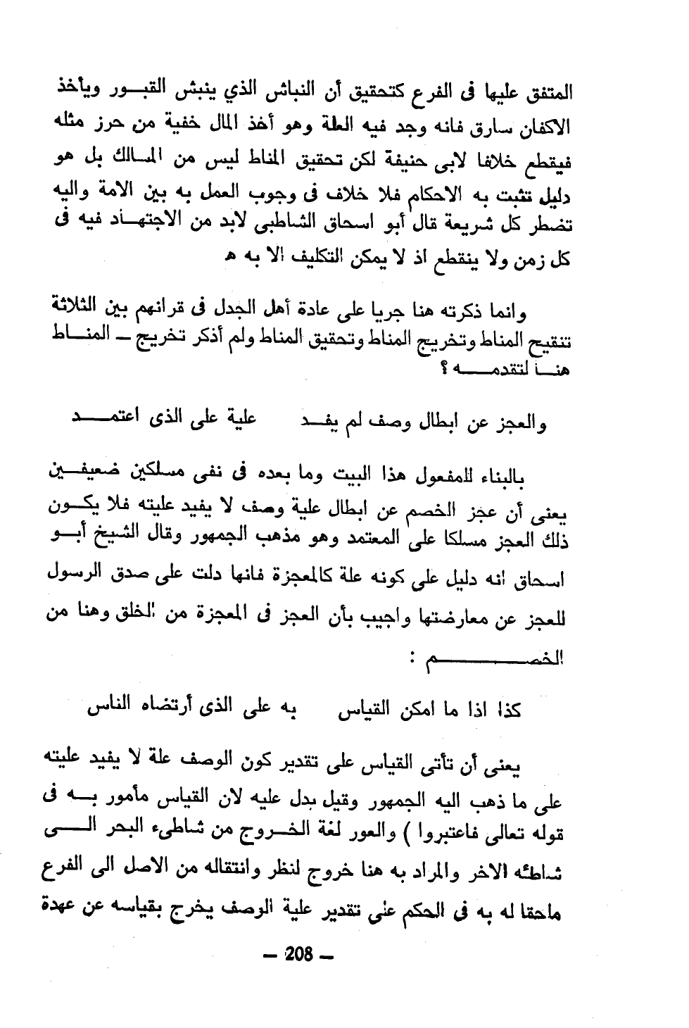 المتفق عليها في الفرع كتحقيق أن النباش الذي ينبش القبور ويأخذ الأكفان سارق فإنه وجد فيه العلة وهو أخذ المال خفية من حرز مثله فيقطع خلافًا لأبي حنيفة لكن تحقيق المناط ليس من المسالك بل هو دليل تثبت به الأحكام فلا خلاف في وجوب العمل به بين الأمة وإليه تضطر كل شريعة قال أبو إسحاق الشاطبي لابد من الاجتهاد فيه في كل زمن لابد من الاجتهاد فيه في كل زمن ولا ينقطع إذ لا يمكن التكليف إلا به هـ