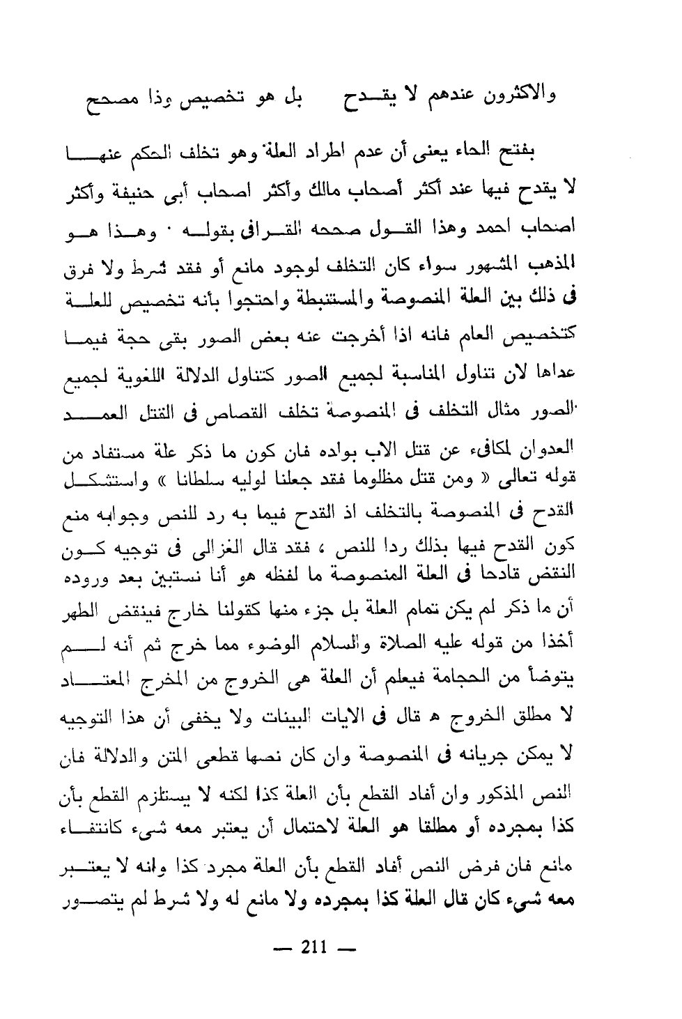بفتح الحاء يعني أن عدم اطراد العلة وهو تخلف الحكم عنها لا يقدح فيها عند أكثر أصحاب مالك وأكثر أصحاب أبي حنيفة وأكثر أصحاب أحمد وهذا القول صححه القرافي بقوله وهذا هو المذهب المشهور سواء كان التخلف لوجود مانع أو فقد شرط ولا فرق في ذلك بين العلة المنصوصة والمستنبطة واحتجوا بأنه تخصيص للعلة كتخصيص العام فإنه إذا خرجت عنه بعض الصور بقي حجة فيما عداها لأن تناول المناسبة لجميع الصور كتناول الدلالة اللغوية لجميع الصور مثال التخلف في المنصوصة تخلف القصاص في القتل العمد العدوان لمكافئ عن قتل الأب بولده فإن كون ما ذكر علة مستفاد من قوله تعالى ((ومن قتل مظلوما فقد جعلنا لوليه سلطانا)) واستشكل القدح في المنصوصة بالتخلف إذ القدح فيما به رد للنص وجوابه منع كون القدح فيها بذلك ردًا للنص، فقد قال الغزالي في توجيه كون النقض قادحًا في العلة المنصوصة ما لفظه هو أنا نستبين بعد وروده أن ما ذكر لم يكن تمام العلة بل جزء منها كقولنا خارج فينقض الطهر أخذًا من قوله عليه الصلاة والسلام الوضوء مما خرج ثم أنه لم يتوضأ من الحجامة فيعلم أن العلة هي الخروج من المخرج المعتاد لا مطلق الخروج هـ قال في الآيات البينات ولا يخفى أن هذا التوجيه لا يمكن جريانه في المنصوصة وإن كان نصها قطعي المتن والدلالة فإن النص المذكور وإن أفاد القطع بأن العلة كذا لكنه لا يستلزم القطع بأن كذا بمجرده أو مطلقًا هو العلة لاحتمال أن يعتبر معه شيء كانتفاء مانع فإن فرض النص أفاد القطع بأن العلة مجرد كذا وأنه لا يعتبر معه شيء كان قال العلة كذا بمجرده ولا مانع له ولا شرط لم يتصور