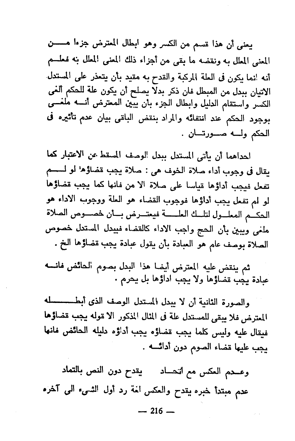 والصورة الثانية أن لا يبدل المستدل الوصف الذي أبطله المعترض فلا يبقى للمستدل علة في المثال المذكور إلا قوله يجب قضاؤها فيقال عليه وليس كلما يجب قضاؤه يجب أداؤه دليله الحائض فإنها يجب عليها قضاء الصوم دون أدائه.