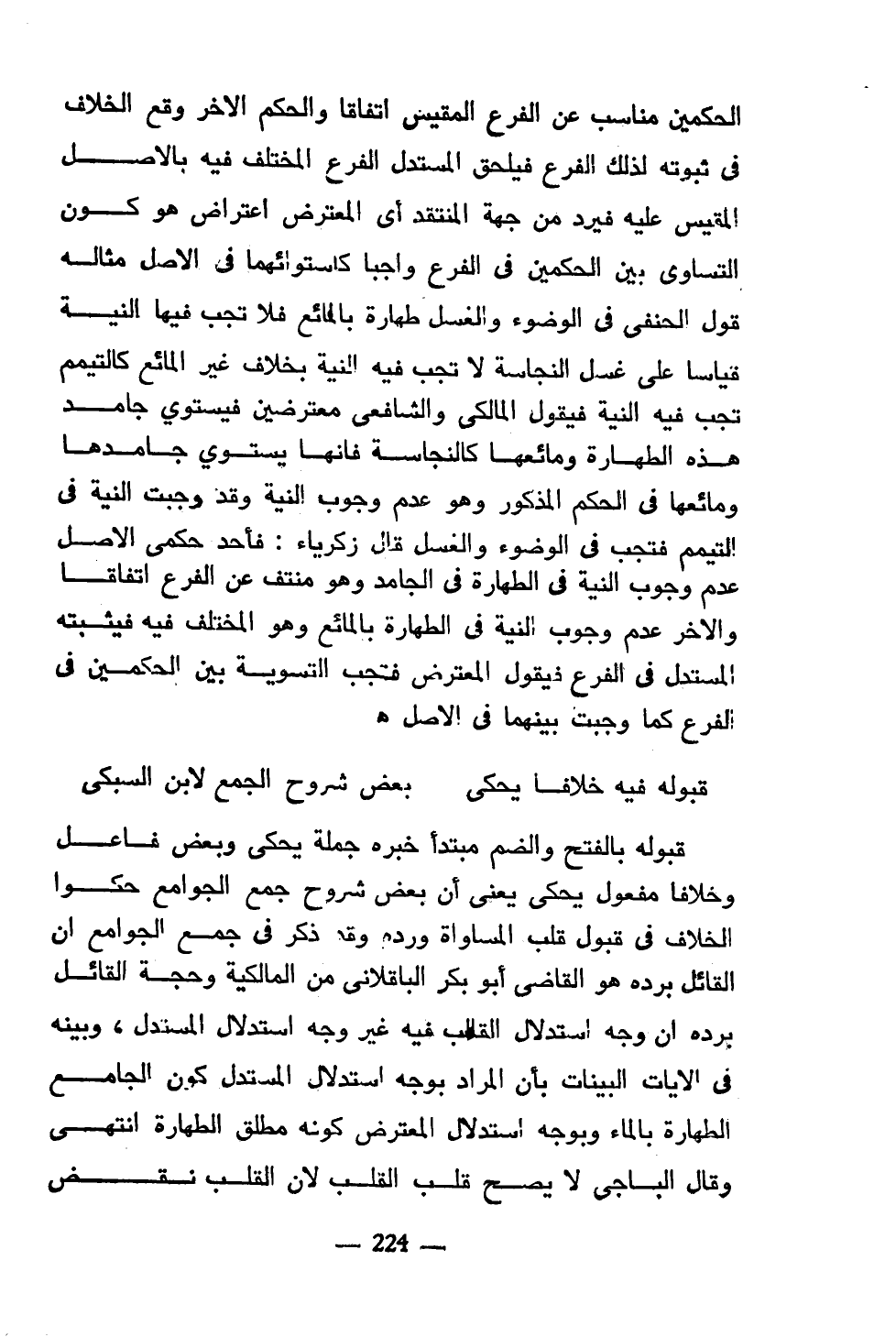 الحكمين مناسب عن الفرع المقيس اتفاقًا والحكم الآخر وقع الخلاف في ثبوته لذلك الفرع فيلحق المستدل الفرع المختلف فيه بالأصل المقيس عليه فيرد من جهة المنتقد أي المعترض اعتراض هو كون التساوي بين الحكمين في الفرع واجبًا كاستوائهما في الأصل مثاله قول الحنفي في الوضوء والغسل طهارة بالمائع فلا تجب فيها النية قياسًا على غسل النجاسة لا تجب فيه النية بخلاف غير المائع كالتيمم تجب فيه النية فيقول المالكي والشافعي معترضين فيستوي جامد هذه الطهارة ومائعها كالنجاسة فإنها يستوي جامدها ومائعها في الحكم المذكور وهو عدم وجوب النية وقد وجبت النية في التيمم فتجب في الوضوء والغسل قال زكرياء: فأحد حكمي الأصل عدم وجوب النية في الطهارة في الجامد وهو منتف عن الفرع اتفاقًا والآخر عدم وجوب النية في الطهارة بالمائع وهو المختلف فيه فيثبته المستدل في الفرع فيقول المعترض فتجب التسوية بين الحكمين في الفرع كما وجبت بينهما في الأصل.