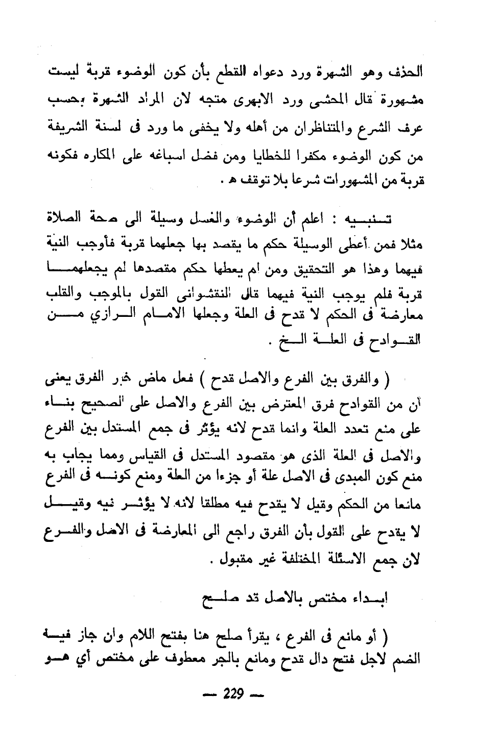 الحذف وهو الشهرة ورد دعواه القطع بأن كون الوضوء قربة ليست مشهورة قال المحشي ورد الأبهري متجه لأن المراد الشهرة بحسب عرف الشرع والمتناظران من أهله ولا يخفي ما ورد في السنة الشريفة من كون الوضوء مكفرًا للخطايا ومن فضل إسباغه على المكاره فكونه قربة من المشهورات شرعًا بلا توقف هـ.