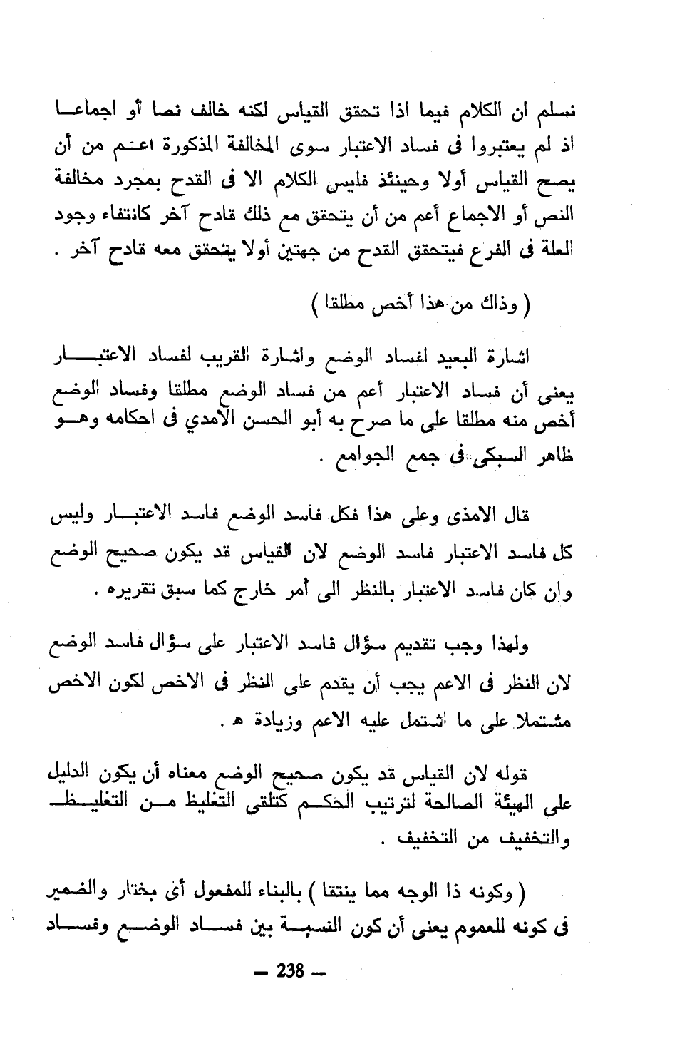 ولهذا وجب تقديم سؤال فاسد الاعتبار على سؤال فاسد الوضع لأن النظر في الأعم يجب أن يقدم على النظر في الأخص لكون الأخص مشتملًا على ما اشتمل عليه الأعم وزيادة هـ.