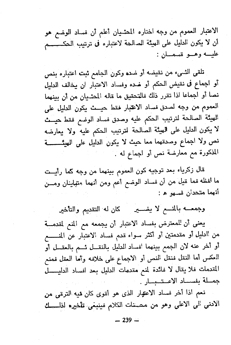 الاعتبار العموم من وجه اختاره المحشيان أعلم أن فساد الوضع هو أن لا يكون الدليل على الهيئة الصالحة لاعتباره في ترتيب الحكم عليه وهو قسمان: