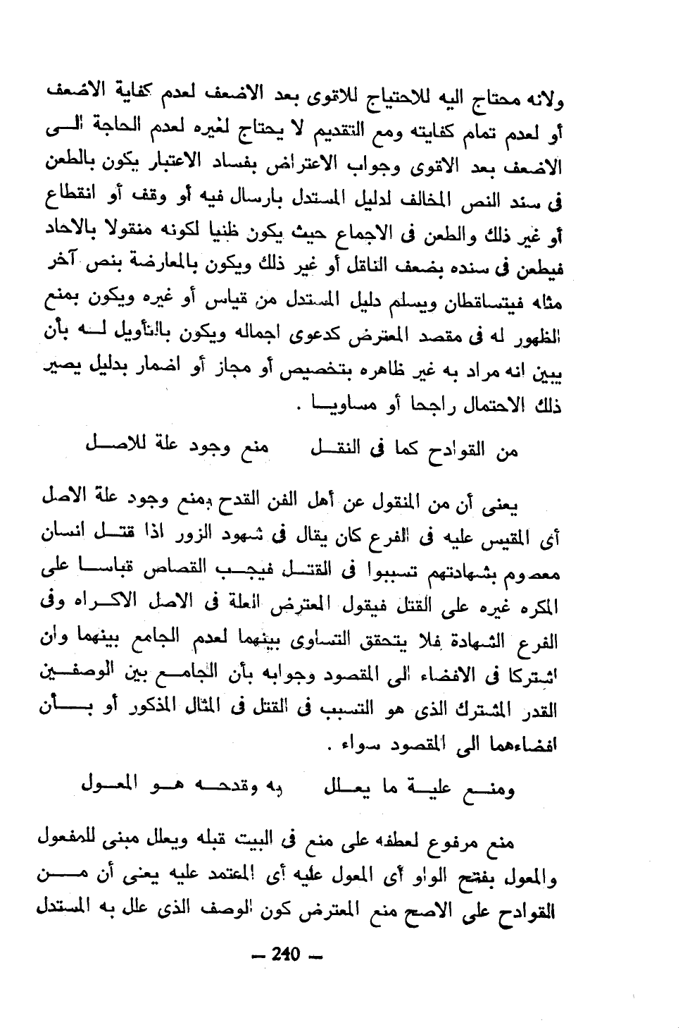 ولأنه محتاج إليه للاحتياج للأقوى بعد الأضعف لعدم كفاية الأضعف أو لعدم تمام كفايته ومع التقديم لا يحتاج لغيره لعدم الحاجة إلى الأضعف بعد الأقوى وجواب الاعتراض بفساد الاعتبار يكون بالطعن في سند النص المخالف لدليل المستدل بإرسال فيه أو وقف أو انقطاع أو غير ذلك والطعن في الإجماع حيث يكون ظنيًا لكونه منقولًا بالآحاد فيطعن في سنده بضعف الناقل أو غير ذلك ويكون بالمعارضة بنص آخر مثله فيتساقطان ويسلم دليل المستدل من قياس أو غيره ويكون بمنع الظهور له في مقصد المعترض كدعوى إجماله ويكون بالتأويل له بأن يبين أنه مراد به غير ظاهره بتخصيص أو مجاز أو إضمار بدليل يصير ذلك الاحتمال راجحًا أو مساويًا.