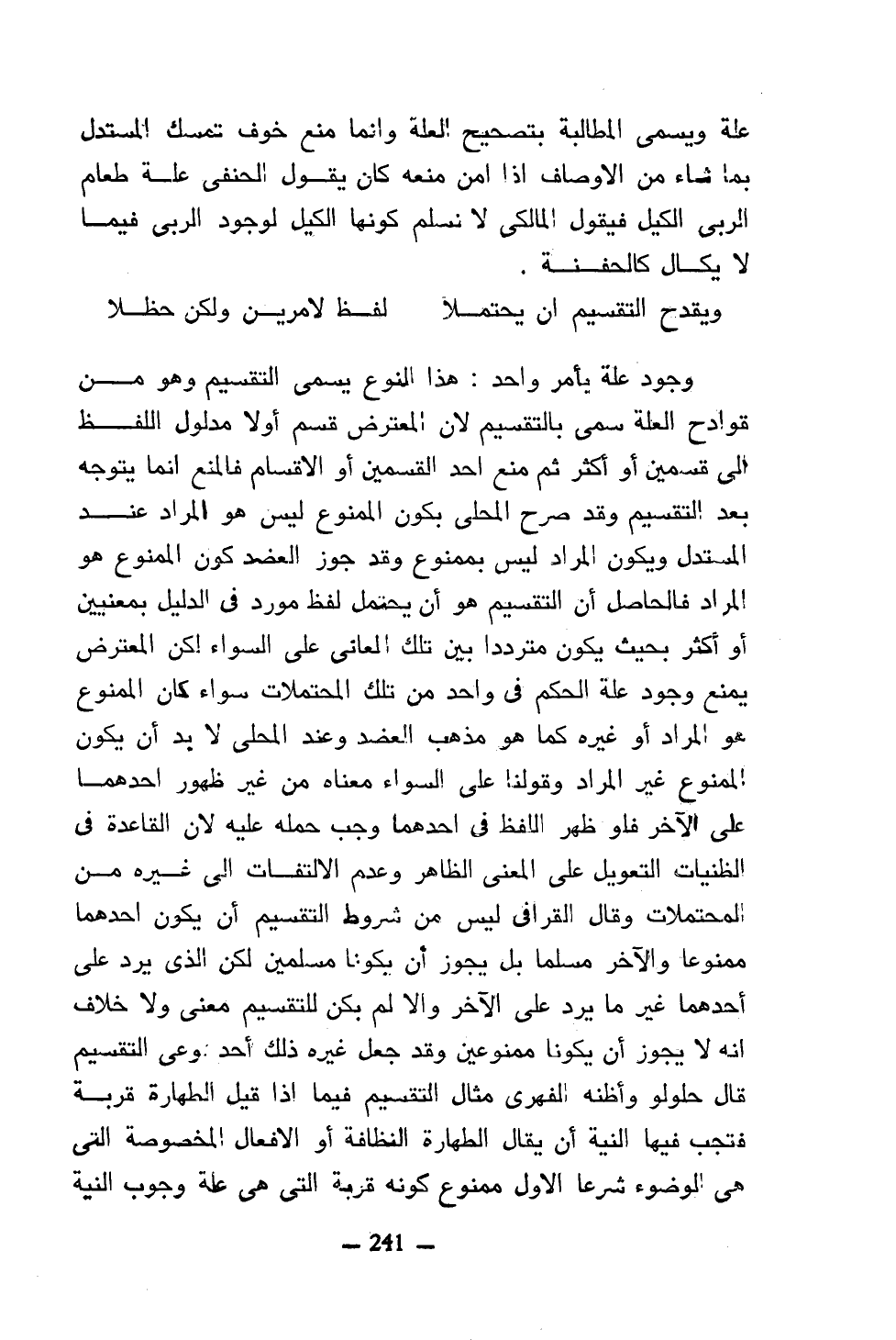 وجود علة بأمر واحد: هذا النوع يسمى التقسيم وهو من قوادح العلة سمي بالتقسيم لأن المعترض قسم أولًا مدلول اللفظ إلى قسمين أو أكثر ثم منع أحد القسمين أو الأقسام فالمنع إنما يتوجه بعد التقسيم وقد صرح المحلي بكون الممنوع ليس هو المراد عند المستدل ويكون المراد ليس بممنوع وقد جوز العضد كون الممنوع هو المراد فالحاصل أن التقسيم هو أن يحتمل لفظ مورد في الدليل بمعنيين أو أكثر بحيث يكون مترددًا بين تلك العاني على السواء لكن المعترض يمنع وجود علة الحكم في واحد من تلك المحتملات سواء كان الممنوع هو المراد أو غيره كما هو مذهب العضد وعند المحلي لا بد أن يكون الممنوع غير المراد وقولنا على السواء معناه من غير ظهور أحدهما على الآخر فلو ظهر اللفظ في أحدهما وجب حمله عليه لأن القاعدة في الظنيات التعويل على المعنى الظاهر وعدم الالتفات إلى غيره من المحتملات وقال القرافي ليس من شروط التقسيم أن يكون أحدهما ممنوعًا والآخر مسلمًا بل يجوز أن يكونا مسلمين لكن الذي يرد على أحدهما غير ما يرد على الآخر وإلا لم يكن للتقسيم معنى ولا خلاف أنه لا يجوز أن يكونا ممنوعين وقد جعل غيره ذلك أحد نوعي التقسيم قال حلولو وأظنه الفهري مثال التقسيم فيما إذا قيل الطهارة قربة فتجب فيها النية أن يقال الطهارة النظافة أو الأفعال المخصوصة التي هي الوضوء شرعًا الأول ممنوع كونه قربة التي هي علة وجوب النية
