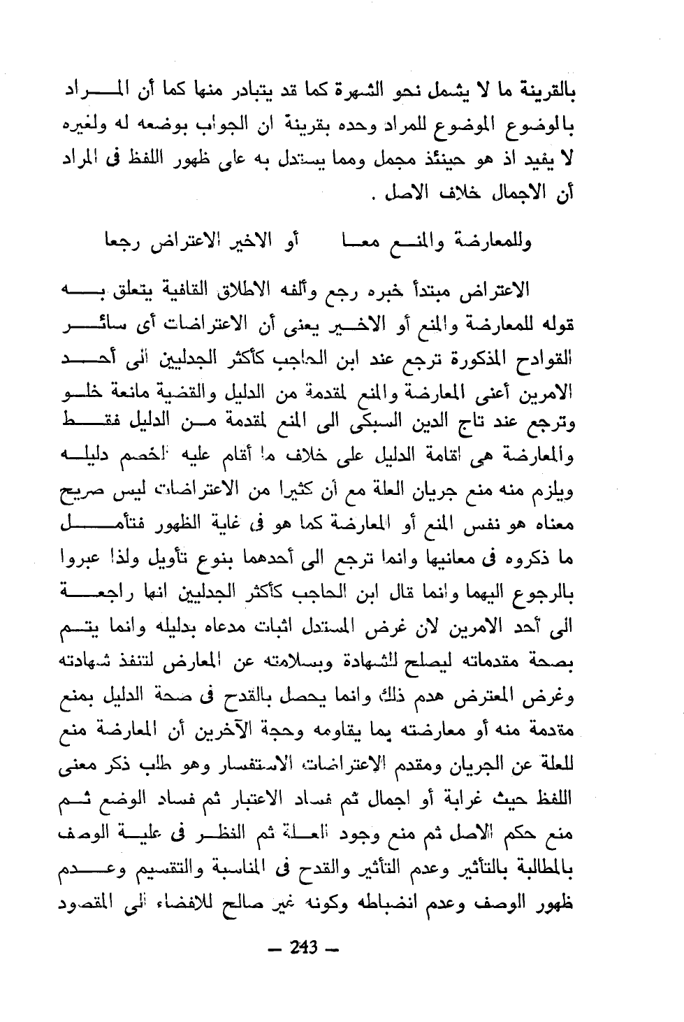 الاعتراض مبتدأ خبره رجع وألفه الإطلاق القافية يتعلق به قوله للمعارضة والمنع أو الأخير يعني أن الاعتراضات أي سائر القوادح المذكورة ترجع عند ابن الحاجب كأكثر الجدليين إلى أحد الأمرين أعني المعارضة والمنع لمقدمة من الدليل والقضية مانعة خلو وترجع عند تاج الدين السبكي إلى المنع لمقدمة من الدليل فقط والمعارضة هي إقامة الدليل على خلاف ما أقام عليه الخصم دليله ويلزم منه منع جريان العلة مع أن كثيرًا من الاعتراضات ليس صريح معناه هو نفس المنع أو المعارضة كما هو في غاية الظهور فتأمل ما ذكروه في معانيها وإنما ترجع إلى أحدهما بنوع تأويل ولذا عبروا بالرجوع إليهما وإنما قال ابن الحاجب كأكثر الجدليين إنها راجعة إلى أحد الأمرين لأن غرض المستدل إثبات مدعاه بدليله وإنما يتم بصحة مقدماته ليصلح للشهادة وبسلامته عن المعارض لتنفذ شهادته وغرض المعترض هدم ذلك وإنما يحصل بالقدح في صحة الدليل بمنع مقدمة منه أو معارضته بما يقاومه وحجة الآخرين أن المعارضة منع للعلة عن الجريان ومقدم الاعتراضات الاستفسار وهو طلب ذكر معنى اللفظ حيث غرابة أو إجمال ثم فساد الاعتبار ثم فساد الوضع ثم منع حكم الأصل ثم منع وجود العلة ثم النظر في علية الوصف بالمطالبة بالتأثير وعدم التأثير والقدح في المناسبة والتقسيم وعدم ظهور الوصف وعدم انضباطه وكونه غير صالح للإفضاء إلى المقصود