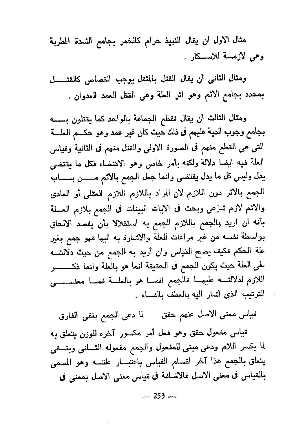 ومثال الثالث أن يقال تقطع الجماعة بالواحد كما يقتلون به بجامع وجوب الدية عليهم في ذلك حيث كان غير عمد وهو حكم العلة التي هي القطع منهم في الصورة الأولى والقتل منهم في الثانية وقياس العلة فيه أيضًا دلالة ولكنه بأمر خاص وهو الاقتضاء فكل ما يقتضي يدل وليس كل ما يدل يقتضي وإنما جعل الجمع بالإثم من باب الجمع بالأثر دون اللازم لأن المراد باللازم اللازم العقلي أو العادي والإثم لازم شرعي وبحث في الآيات البينات في الجمع بلازم العلة بأنه إن أريد بالجمع باللازم الجمع به استقلالًا بأن يقصد الإلحاق بواسطة نفسه من غير مراعات للعلة والإشارة به إليها فهو جمع بغير علة الحكم فكيف يصح القياس وإن أريد به الجمع من حيث دلالته على العلة حيث يكون الجمع في الحقيقة إنما هو بالعلة وإنما ذكر اللازم لدلالته عليها فالجمع إنما هو بالعلة فما معنى الترتيب الذي أشار إليه بالعطف بالفاء.