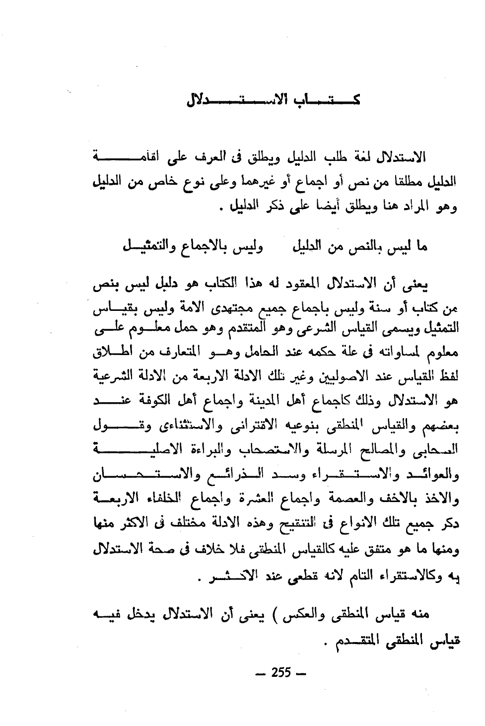 يعني أن الاستدلال المعقود له هذا الكتاب هو دليل ليس بنص من كتاب أو سنة وليس بإجماع جميع مجتهدي الأمة وليس بقياس التمثيل ويسمى القياس الشرعي وهو المتقدم وهو حمل معلوم على معلوم لمساواته في علة حكمه عند الحامل وهو المتعارف من إطلاق لفظ القياس عند الأصوليين وغير تلك الأدلة الأربعة من الأدلة الشرعية هو الاستدلال وذلك كإجماع أهل المدينة وإجماع أهل الكوفة عند بعضهم والقياس المنطقي بنوعيه الاقتراني والاستثنائي وقول الصحابي والمصالح المرسلة والاستصحاب والبراءة الأصلية والعوائد والاستقراء وسد الذرائع والاستحسان والأخذ بالأخف والعصمة وإجماع العشرة وإجماع الخلفاء الأربعة ذكر جميع تلك الأنواع في التنقيح وهذه الأدلة مختلف في الأكثر منها ومنها ما هو متفق عليه كالقياس المنطقي فلا خلاف في صحة الاستدلال به وكالاستقراء التام لأنه قطعي عند الأكثر.