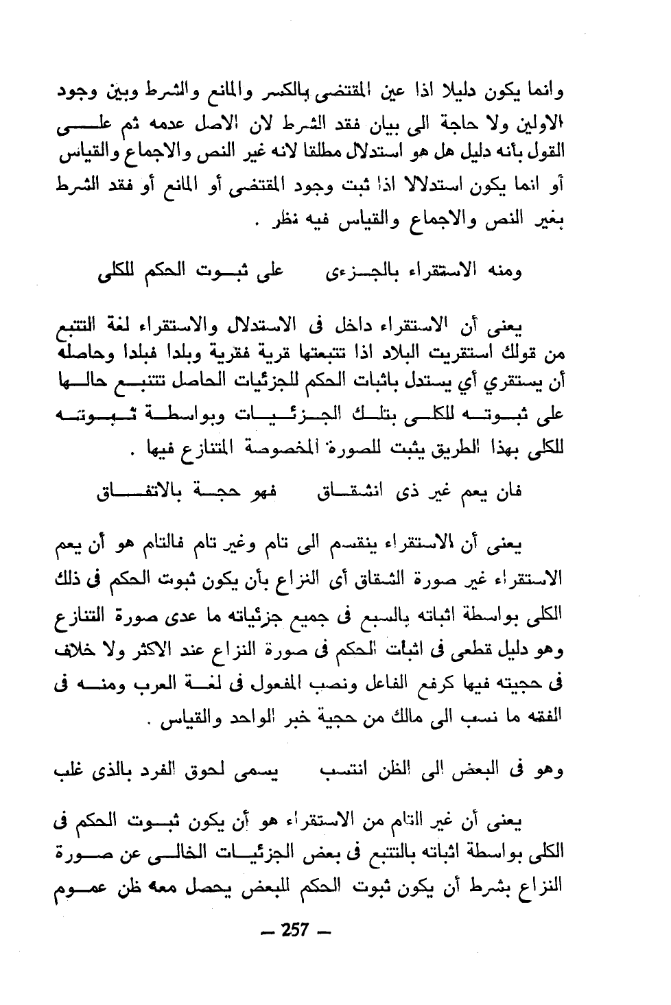 يعني أن الاستقراء ينقسم إلى تام وغير تام فالتام هو أن يعم الاستقراء غير صورة الشقاق أي النزاع بأن يكون ثبوت الحكم في ذلك الكلي بواسطة إثباته بالسبع في جميع جزيئاته ما عدى صورة التنازع وهو دليل قطعي في إثبات الحكم في صورة النزاع عند الأكثر ولا خلاف في حجيته فيها كرفع الفاعل ونصب المفعول في لغة العرب ومنه في الفقه ما نسب إلى مالك من حجية خبر الواحد والقياس.