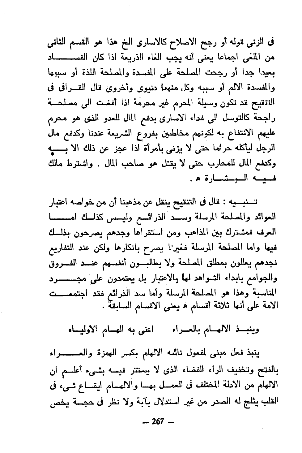 في الزنى قوله أو رجح الإصلاح كالاسارى الخ هذا هو القسم الثاني من الملغي إجماعًا يعنى أه يجب إلغاء الذريعة إذا كان الفساد بعيدًا جدًا أو رجحت المصلحة على المفسدة والمصلحة اللذة أو سببها والمفسدة الألم أو سببه وكل منهما دنيوي وأخروي قال القرافي في التنقيح قد تكون وسيلة المحرم غير محرمة إذا أفضت إلى مصلحة راجحة كالتوسل إلى فداء الاسارى بدفع المال للعدو الذي هو محرم عليهم الانتفاع به كالانتفاع به لكونهم مخاطين بفروع الشريعة عندنا وكدفع مال الرجل ليأكله حرامًا حتى لا يزني بامرأة إذا عجز عن ذلك إلا به وكدفع المال للمحارب حتى لا يقتل هو صاحب المال. واشترط مالك فيه البشارة هـ.