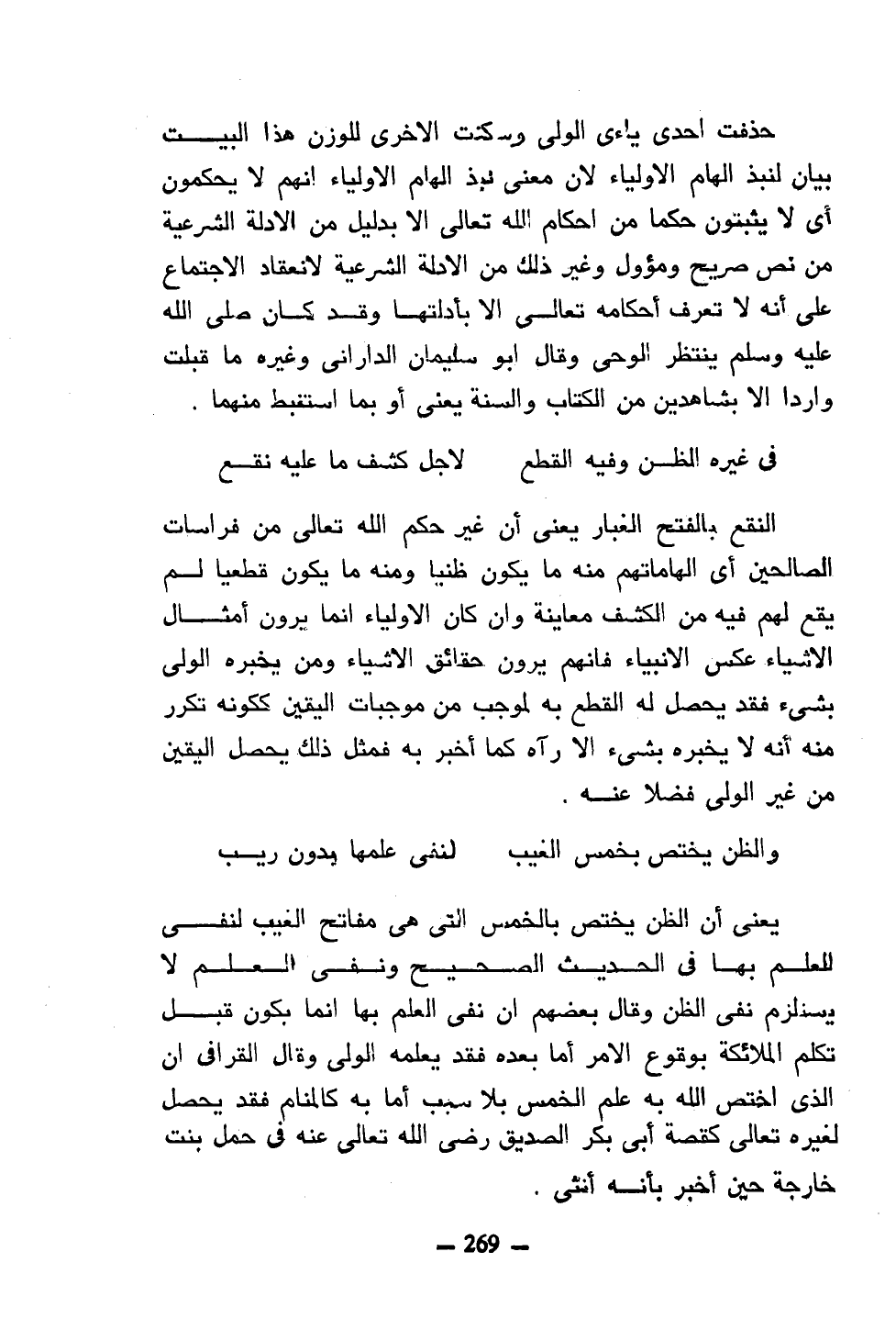 حذفت إحدى ياءي الولي وسكنت الأخرى للوزن هذا البيت بيان لنبذ الهام الأولياء لأن معنى نبذ إلهام الأولياء إنهم لا يحكمون أي لا يثبتون حكمًا من أحكام الله تعالى إلا بدليل من الأدلة الشرعية من نص صريح ومؤول وغير ذلك من الأدلة الشرعية لانعقاد الاجتماع على أنه لا تعرف أحكامه تعالى إلا بأدلتها وقد كان صلى الله وعليه وسلم ينتظر الوحي وقال أبو سليمان الداراني وغيره ما قبلت واردًا إلا بشاهدين من الكتاب والسنة يعني بما استنبط منهما.