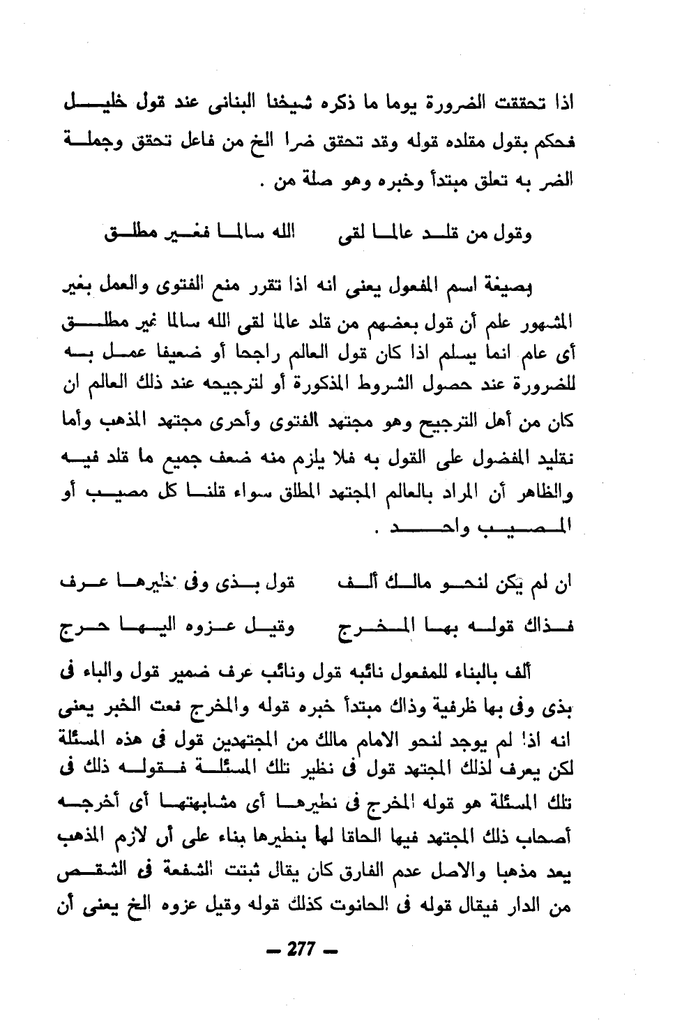 إذا تحققت الضرورة يومًا ما ذكره شيخنا البناني عند قول خليل فحكم بقول مقلده قوله وقد تحقق ضرًا الخ من فاعل تحقق وجملة الضر به تعلق مبتدأ وخبره وهو صلة من.