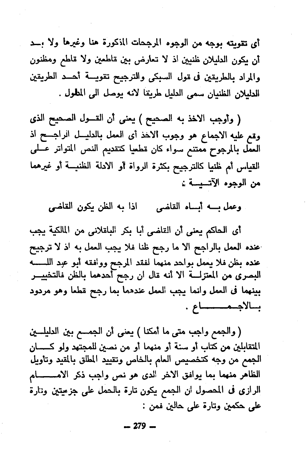 (وأوجب الأخذ به الصحيح) يعني أن القول الصحيح الذي وقع عليه الإجماع هو وجوب الأخذ أي العمل بالدليل الراجح إذ العمل المرجوح ممتنع سواء كان قطعيًا كتقديم النص المتواتر على القياس أم ظنيًا كالترجيح بكثرة الرواة أو الأدلة الظنية أو غيرها من الوجوه الآتية: