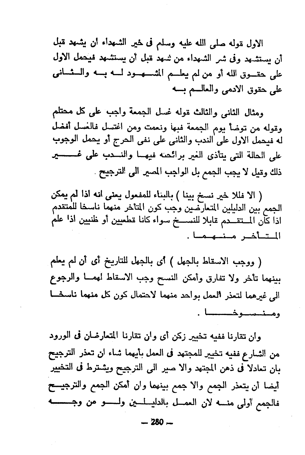 والمثال الثاني والثالث قوله غسل الجمعة واجب على كل محتلم وقوله من توضأ يوم الجمعة فيها ونعمت ومن اغتسل فالغسل أفضل له فيحمل الأول على الندب والثاني على نفي الحرج أو يحمل الوجوب على الحالة التي يتأذى الغير برائحة فيها والندب على غير ذلك وقيل لا يجب الجمع بل الواجب المصير إلى الترجيح.