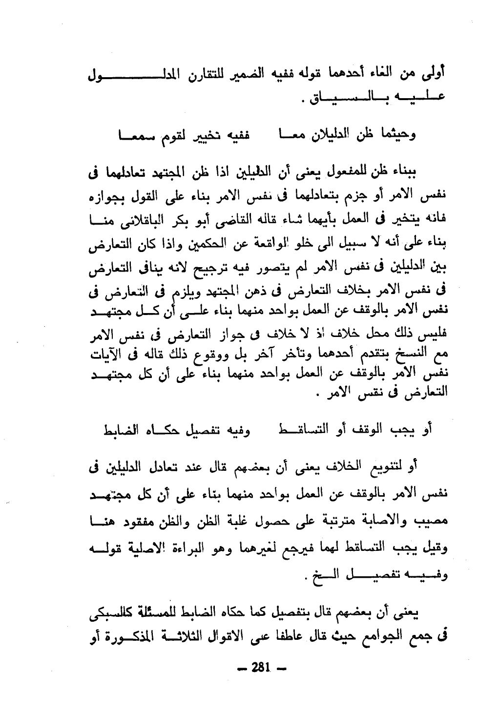ببناء ظن للمفعول يعني أن الدليلين إذا ظن المجتهد تعادلهما في نفس الأمر أو جزم بتعادلهما في نفس الأمر بناء على القول بجوازه فإنه يتخير في العمل بأيهما شاء قاله القاضي أبو بكر الباقلاني منا بناء على أنه لا سبيل إلى خلو الواقعة عن الحكمين وإذا كان التعارض بين الدليلين في نفس المر لم يتصور فيه ترجيح لأنه ينافي التعارض في نفس الأمر بخلاف التعارض في ذهن المجتهد ويلزم في التعارض في نفس الأمر بالوقف عن العمل بواحد منهما بناء على أن كل مجتهد فليس ذلك محل خلاف إذ لا خلاف في جواز التعارض في نفس الأمر مع النسخ بتقديم أحدهما وتأخر آخر بل ووقوع ذلك قاله في الآيات نفس الأمر بالوقف عن العمل بواحد منهما بناء على أن كل مجتهد التعارض في نفس الأمر.