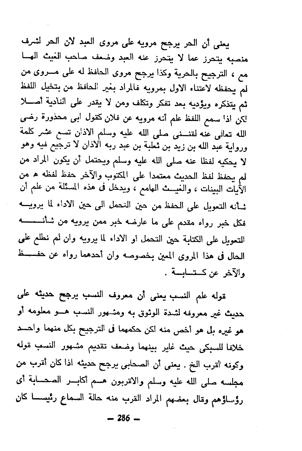 يعني أن الحر يرجح مرويه على مروى العبد لأن الحر لشرف منصبه يتحرز عما لا يتحرز عنه العبد وضعف صاحب الغيث إلهًا مع، الترجيح بالحرية وكذا يرجح مروي الحافظ له على مروي من لم يحفظه لاعتناء الأول بمرويه فالمراد بغير الحافظ من بتخيل اللفظ ثم يتذكره ويؤديه بعد تفكر وتكلف ومن لا يقدر على النادية أصلا لكن إذا سمع اللفظ ثم يتذكره ويؤديه بعد تفكر وتكلف ومن لا يقدر على النادية أصلا لكن إذا سمع اللفظ علم أنه مرويه عن فلان كقول أبي محذورة رضي الله تعالى عنه لقنني صلى الله عليه وسلم الأذان تسع عشر كلمة ورواية عبد الله بن زيد بن ثعلبة بن عبد ربه الأذان لا ترجيح فيه وهو لا يحكيه لفظًا عنه صلى الله وعليه وسلم ويحتمل أن يكون المراد من لم يحفظ لفظ الحديث معتمدًا على المكتوب والآخر حفظ لفظه هـ من الآيات البينات، والغيث الهامع، ويدخل في هذه المسئلة من علم أن شأنه التعويل على الحفظ من حين التحمل أو الأداء لما يرويه وأن لم نطلع على الحال في هذا المروي المعين بخصوصه وأن أحدهما رواه عن حفظ والآخر عن كتابة.