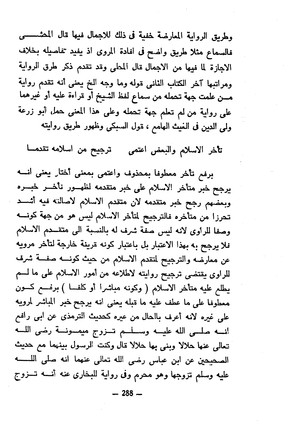 برفع تأخر معطوفًا بمحذوف واعتمي بمعنى اختار يعني أنه يرجح خبر متأخر الإسلام على خبر متقدمه لظهور تأخر خبره وبعضهم رجح خبر متقدمه لأن متقدم الإسلام لأصالته فيه أشد تحرزًا من متأخره فالترجيح لمتأخر الإسلام ليس هو من جهة كونه وصفًا للروي لأنه ليس صفة شرف له بالنسبة إلى متقدم الإسلام فلا يرجح به بهذا الاعتبار بل باعتبار كونه قرينة خارجة لتأخر مرويه عن معارضه والترجيح لمتقدم الإسلام من حيث كونه صفة شرف للراوي يقتضي ترجيح روايته لإطلاعه من أمور الإسلام على ما لم يطلع عليه متأخر الإسلام (وكونه مباشرًا أو كلفًا) برفع كون معطوفًا على ما عطف عليه ما قبله يعني أنه يرجح خبر المباشر لمرويه على غيره لأنه أعرف بالحال من غيره كحديث الترمذي عن أبي رافع أنه صلى الله وعليه وسلم تزوج ميمونة رضي الله تعالى عنها حلالًا وبني بها حلالًا قال وكنت الرسول بينهما مع حديث الصحيحين عن ابن عباس رضي الله تعالى عنهما أنه صلى الله وعليه وسلم تزوجها وهو محرم وفي رواية أخرى للبخاري أنه تزوج