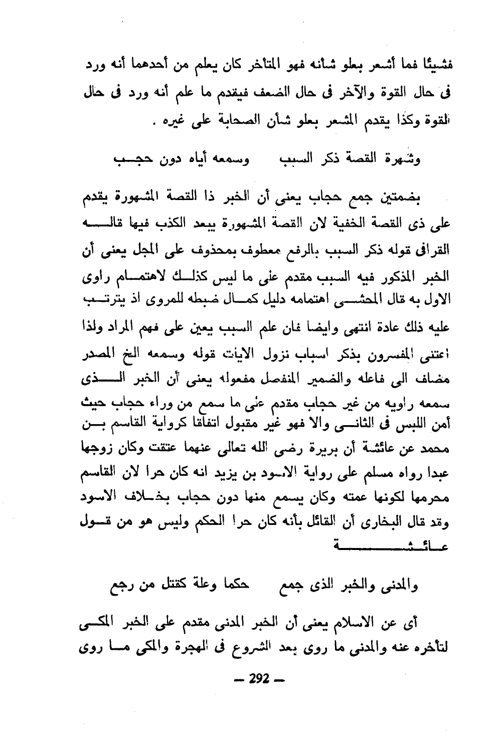 بضمتين جمع حجاب يعني أن الخبر ذا القصة المشهورة يقدم على ذي القصة الخفية لأن القصة المشهورة يبعد الكذب فيها قاله القرافي قوله ذكر السبب بالرفع معطوف بمحذوف على المجل يعني أن الخبر المذكور فيه السبب مقدم على ما ليس كذلك لاهتمام راوي الأول به قال المحشي اهتمامه دليل كمال ضبطه للمروى إذ يترتب عليه ذلك عادة انتهى وايضًا فان علم السبب يعين على فهم المراد ولذا أعتني المفسرون بذكر أسباب نزول الآيات قوله وسمعه الخ المصدر مضاف إلى فاعله والضمير المنفصل مفعوله يعني أن الخبر الذي سمعه راويه من غير حجاب مقدم عني ما سمع من وراء حجاب حيث أمن اللبس في الثاني وإلا فهو غير مقبول اتفاقًا كراوية القاسم بن محمد بن عائشة أبن بريرة رضي الله تعالى عنهما عتقت وكان زوجها عبدا رواه مسلم على راويه الأسود بن يزيد كان حرا لأن القاسم محرمها لكونها عمته وكان يسمع منها دون حجاب بخلاف الأسود وقد قال البخاري أن القائل بأنه كان حرًا الحكم وليس هو من قول عائشة