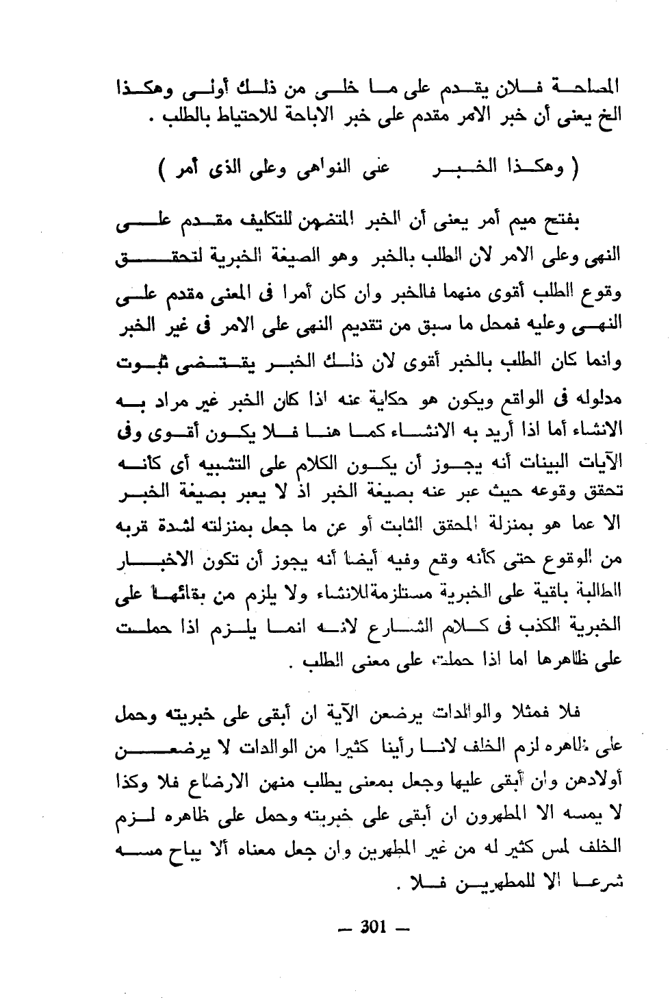 بفتح ميم أمر يعني أن الخبر المتضمنين للتكليف مقدم على النهي وعلى الأمر لأن الطلب بالخبر وهو الصيغة الخبرية لتحقق وقوع الطلب أقوى منهما فالخبر وأن كان أمرًا في المعنى مقدم على النهي وعليه فمحل ما سبق من تقديم النهي على الأمر في غير الخبر وإنما كان الطلب بالخبر أقوى لأن ذلك الخبر يقتضي ثبوت مطولة في الواقع ويكون هو حكاية عنه إذا كان الخبر غير مراد به الإنشاء أما إذا أريد به الإنشاء كما هنا فلا يكون أقوى وفي الآيات البينات أنه يجوز أن يكون الكلام على التشبيه أي كأنه تحقق وقوعه حيث عبر عنه بصيغة الخبر إذ لا يعبر بصيغة الخبر إلا عما هو بمنزلة المحقق الثابت أو عن ما جعل بمنزلته لشدة قربه من الوقوع حتى كأنه وقع فيه أيضًا أنه يجوز أن تكون الأخبار الطالبة باقية على الخبرية مستلزمه للإنشاء ولا يلزم من بقائها على الخبرية الكذب في كلام الشارع لأنه إنما يلزم إذا حملت على ظاهرها إما إذا حملت على معنى الطلب.