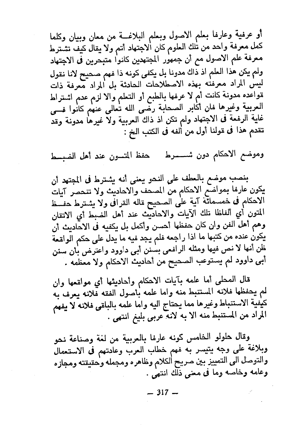 وقال حلولو الخامس كونه عارفًا بالعربية من لغة وصناعة نحو وبلاغة على وجه يتيسر به فهم خطاب العرب وعادتهم في الاستعمال والتوصل إلى التمييز بين صريح الكلام وظاهره ومجمله ومجازه وعامه وخاصة وما في معنى ذلك انتهى.