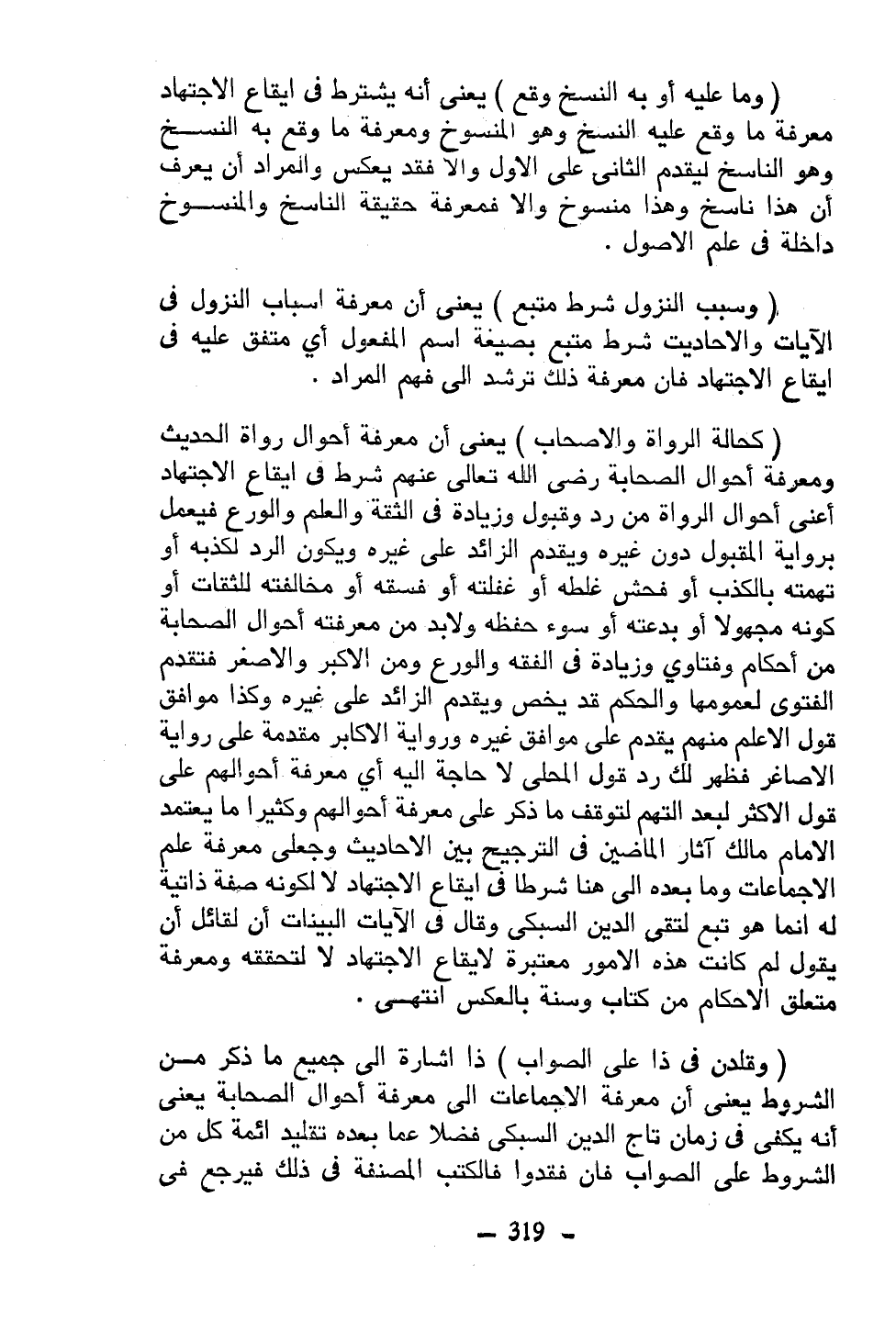 (وسبب النزول شرط متبع) يعني أن معرفة أسباب النزول في الآيات والأحاديث شرط متبع بصيغة اسم المفعول أي متفق عليه في إيقاع الاجتهاد فإن معرفة ذلك ترشد إلى فهم المراد.