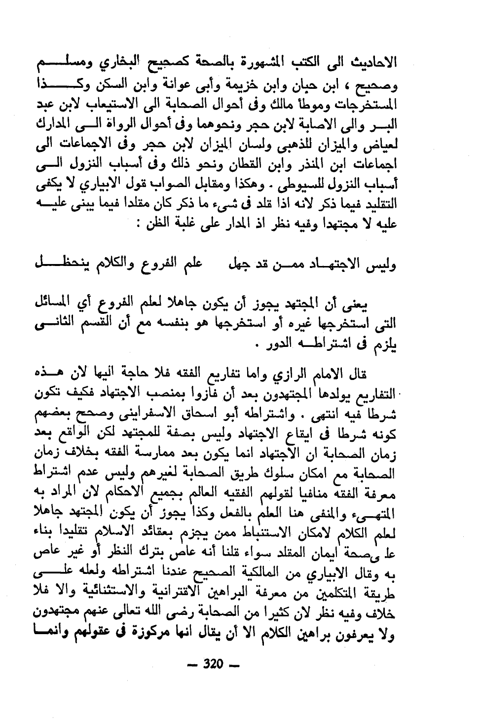 الأحاديث إلى الكتب المشهورة بالصحة كصحيح البخاري ومسلم وصحيح ابن حبان وابن خزيمة وأبي عوانة وابن السكن وكذا المستخرجات وموطأ مالك وفي أحوال الصحابة إلى الاستيعاب لابن عبد البر وإلى الإصابة لابن حجر ونحوهما وفي أحوال الرواة إلى «المدارك» لعياض والميزان للذهبي ولسان الميزان لابن حجر وفي الإجماعات إلى إجماعات ابن المنذر وابن القطان ونحو ذلك وفي أسباب النزول إلى أسباب النزول للسيوطي. وهكذا ومقابل الصواب قول الإبياري لا يكفي التقليد فيما ذكر لأنه إذا قلد في شيء ما ذكر مقلدًا فيما يبنى عليه عليه لا مجتهدًا وفيه نظر إذ المدار على غلبة الظن: