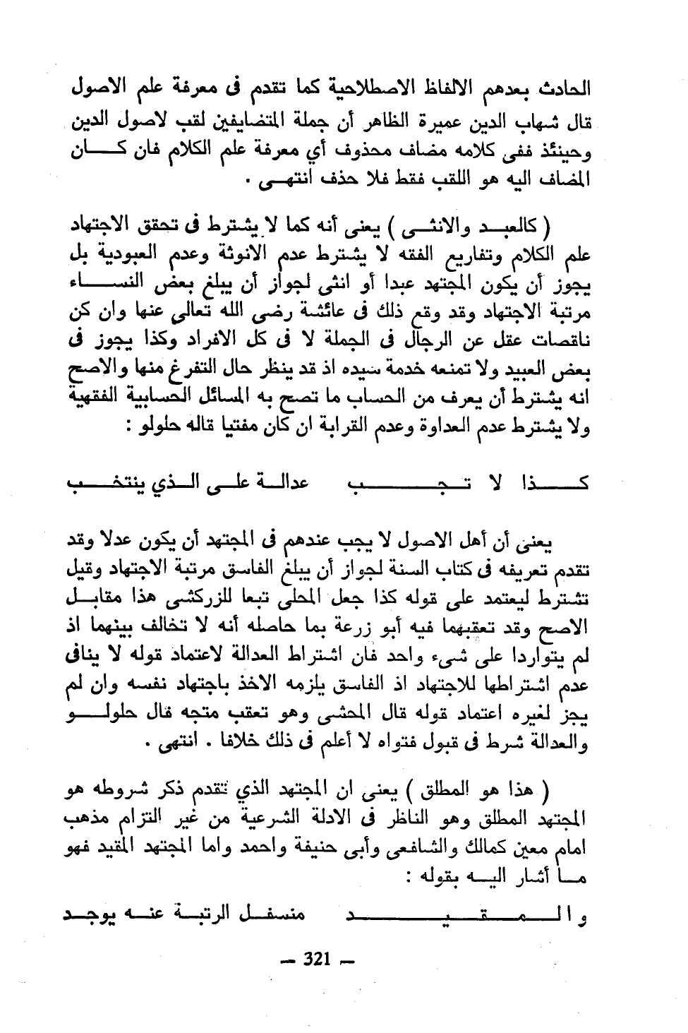 (كالعبد والأنثى) يعني أنه كما لا يشترط في تحقق الاجتهاد علم الكلام وتفاريع الفقه لا يشترط عدم الأنوثة وعدم العبودية بل يجوز أن يكون المجتهد عبدًا أو أنثى لجواز أن يبلغ بعض النساء مرتبة الاجتهاد وقد وقع ذلك في عائشة رضي الله تعالى عنها وإن كن ناقصات عقل عن الرجال في الجملة لا في كل الأفراد وكذا يجوز في بعض العبيد ولا تمنعه خدمة سيده إذ قد ينظر حال التفرغ منها والأصح انه يشترط أن يعرف من الحساب ما تصح به المسائل الحسابية الفقهية ولا يشترط عدم العداوة وعدم القرابة إن كان مفتيًا قاله حلولو: